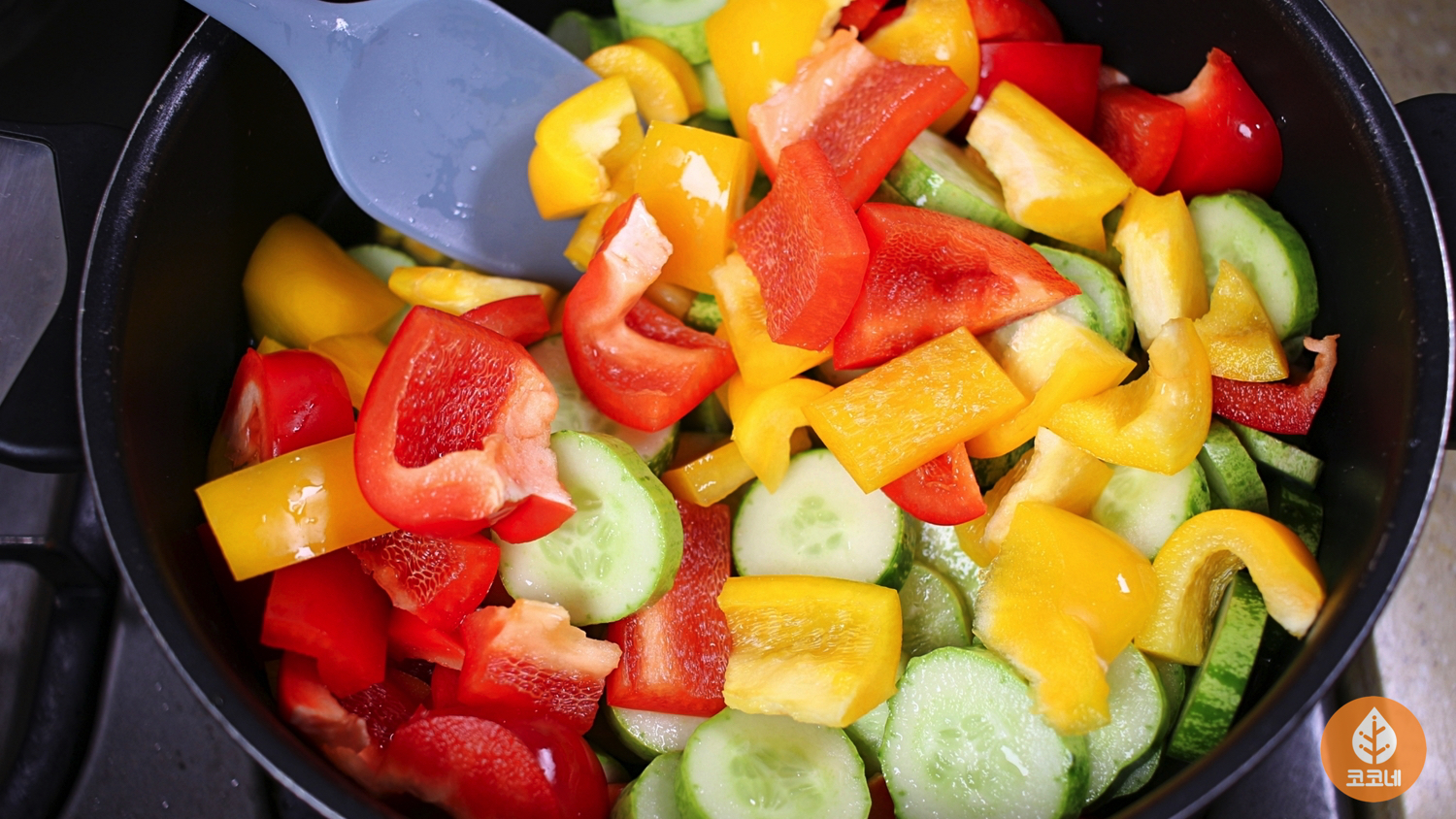 손질한 오이랑 파프리카를 넣어요.
