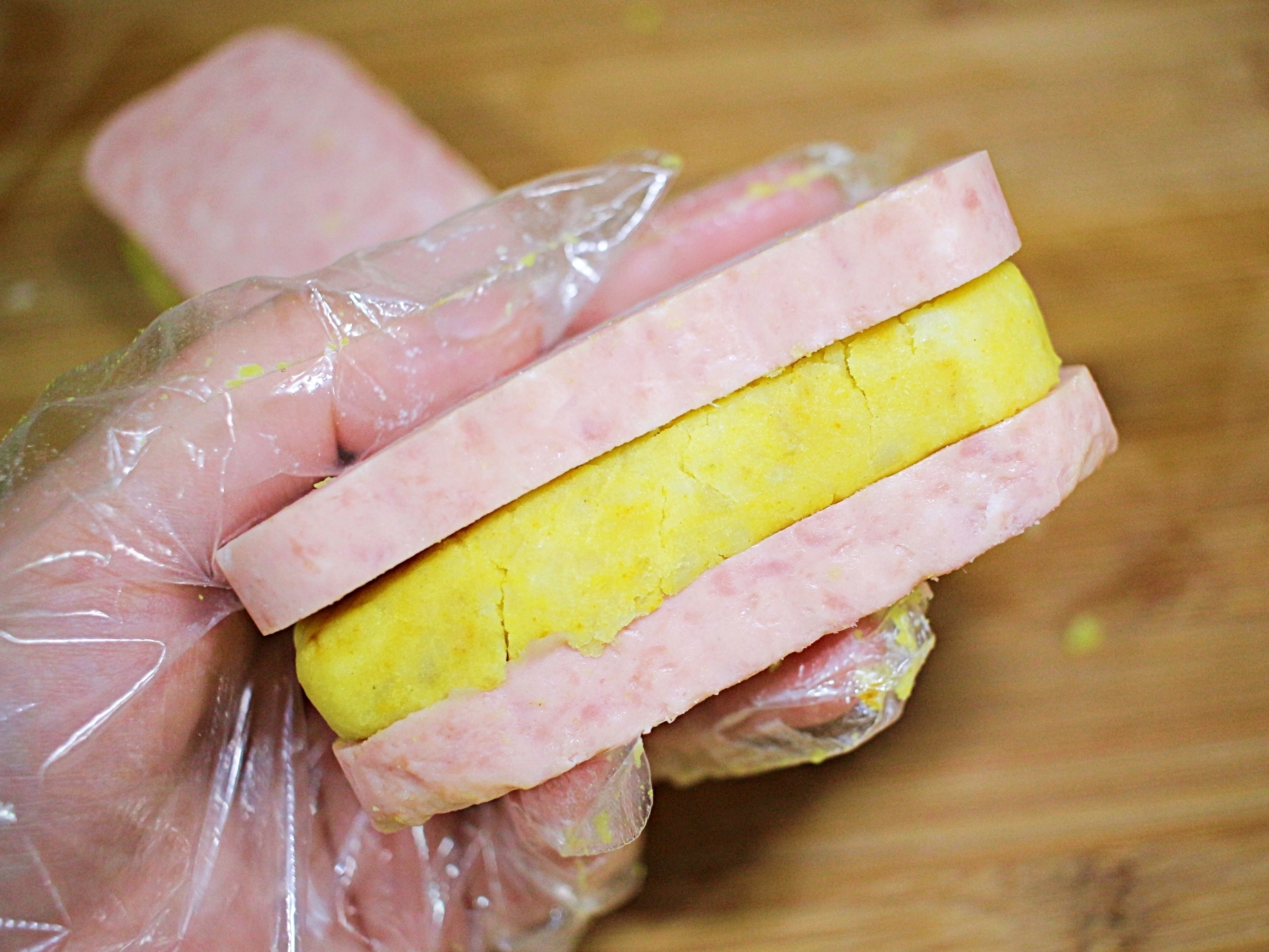 으깬 감자를 스팸 크기에 맞게 빚어서 스팸 사이에 끼워요.