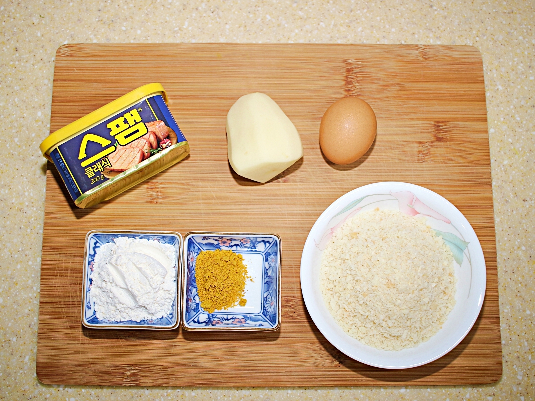 재료는 스팸, 감자, 계란, 밀가루, 카레가루, 빵가루 준비해 주세요.