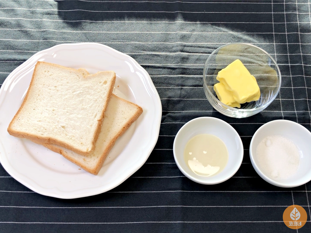 재료는 식빵, 버터, 연유, 설탕 준비해요.
