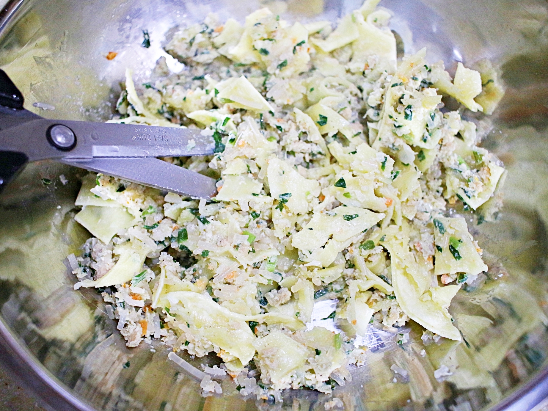 냉동만두를 가위로 잘라주세요.