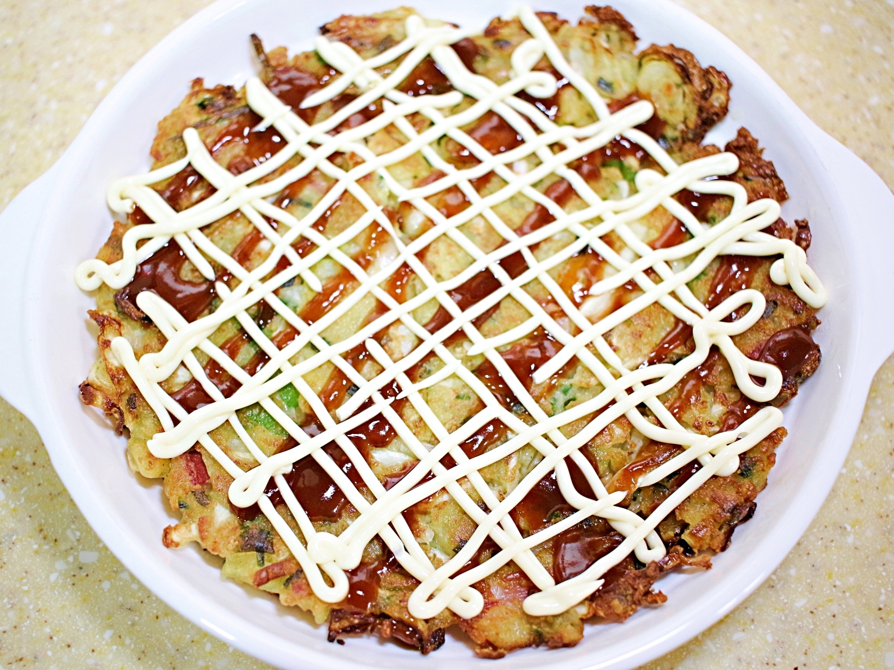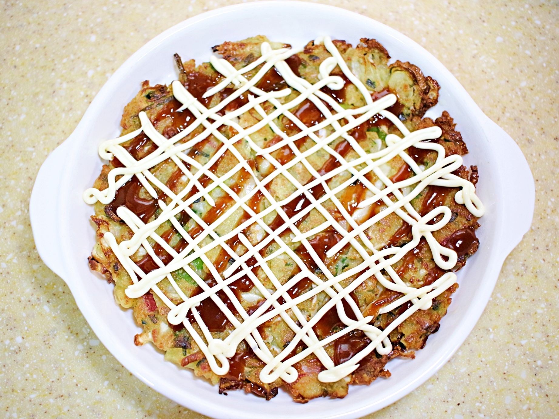 맛있게 구워진 반죽 위에 마요네즈와 돈까스소스를 뿌려요.