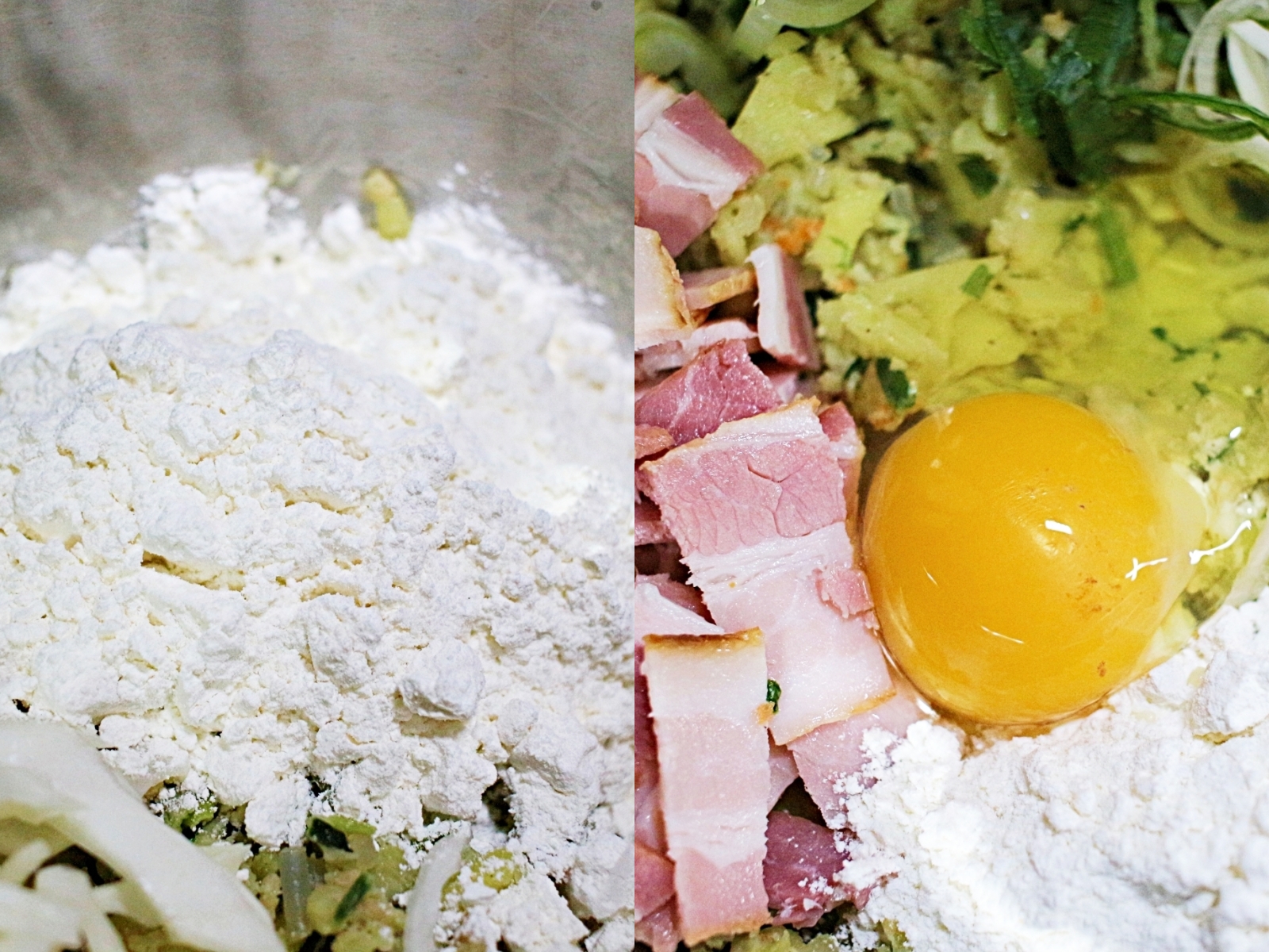 재료는 계란, 부침가루, 양배추, 베이컨, 대파,