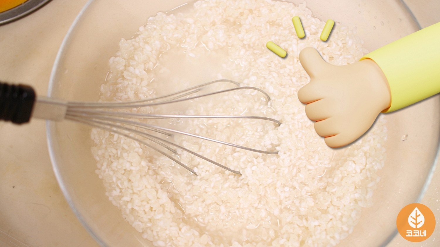 쌀에 눌려서 물 위로 떠오르지 않아요.