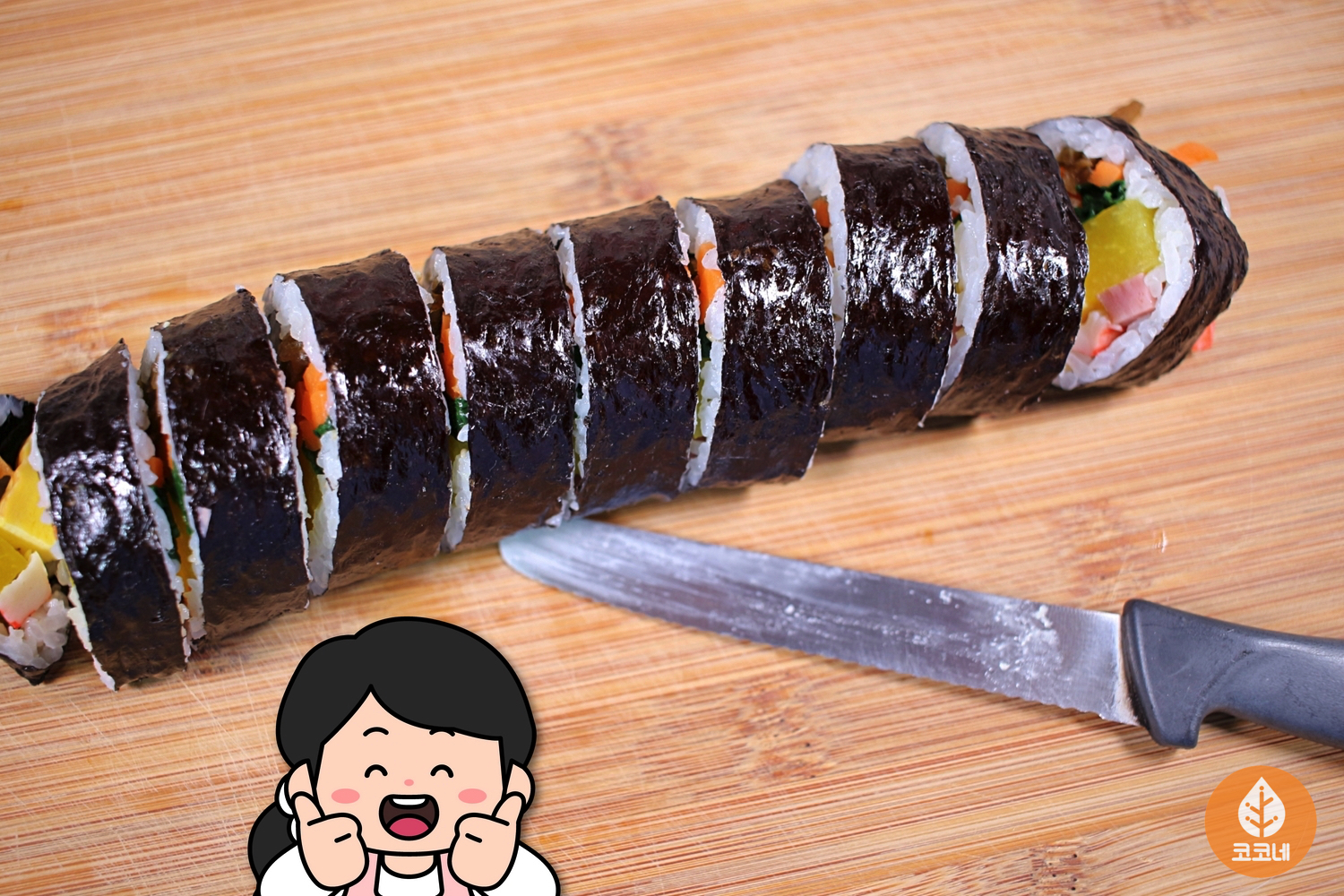 김밥 단면을 깔끔하게 커팅해서