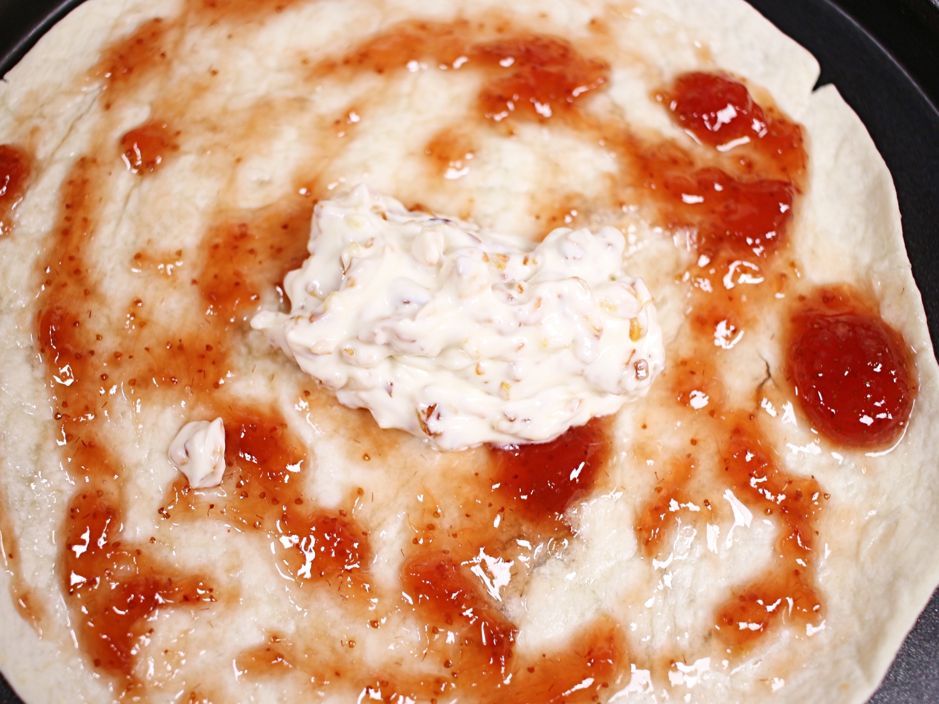 또띠아 위에 딸기잼을 얇게 펴 발라요.