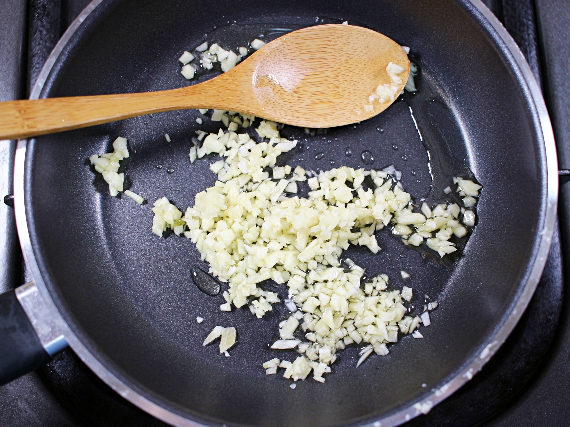 팬에 올리브보일을 두르고 다진마늘을 바삭하게 볶아요.
