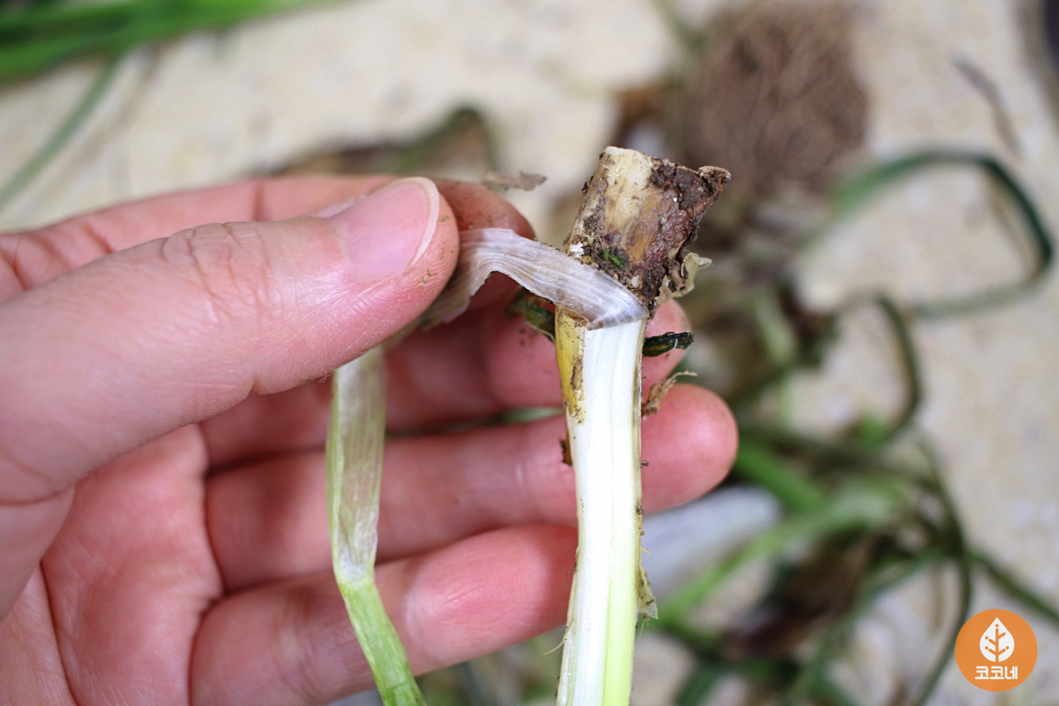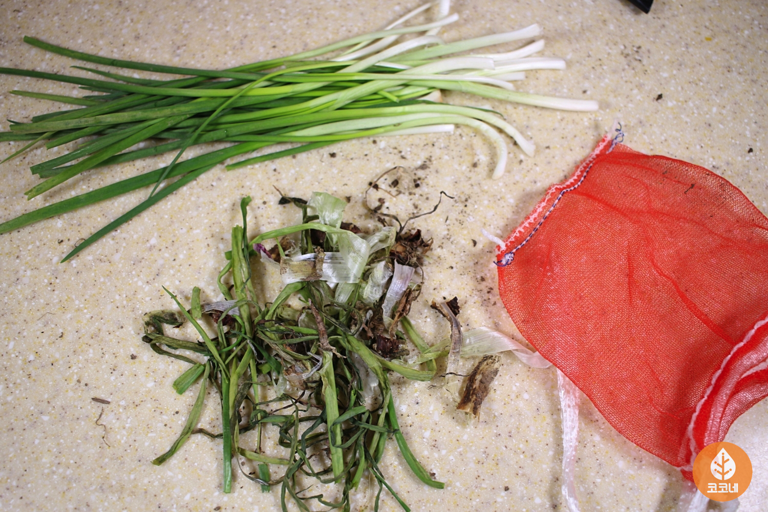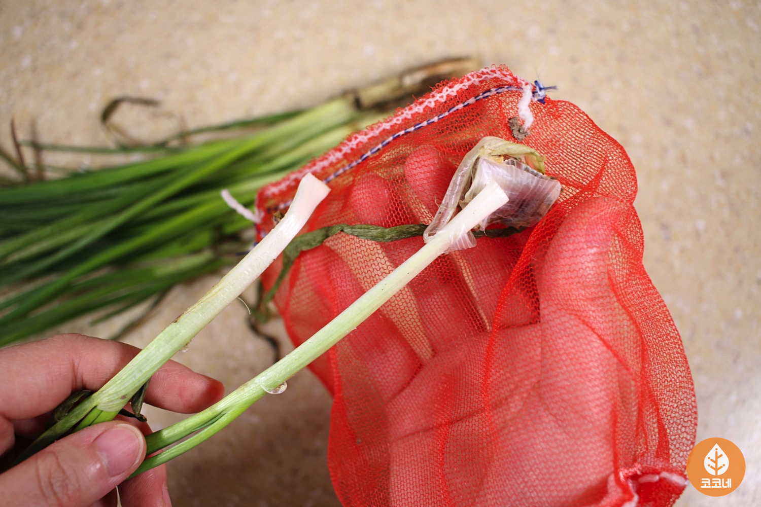 쪽파 줄기를 양파망을 낀 손으로 스윽 밀면