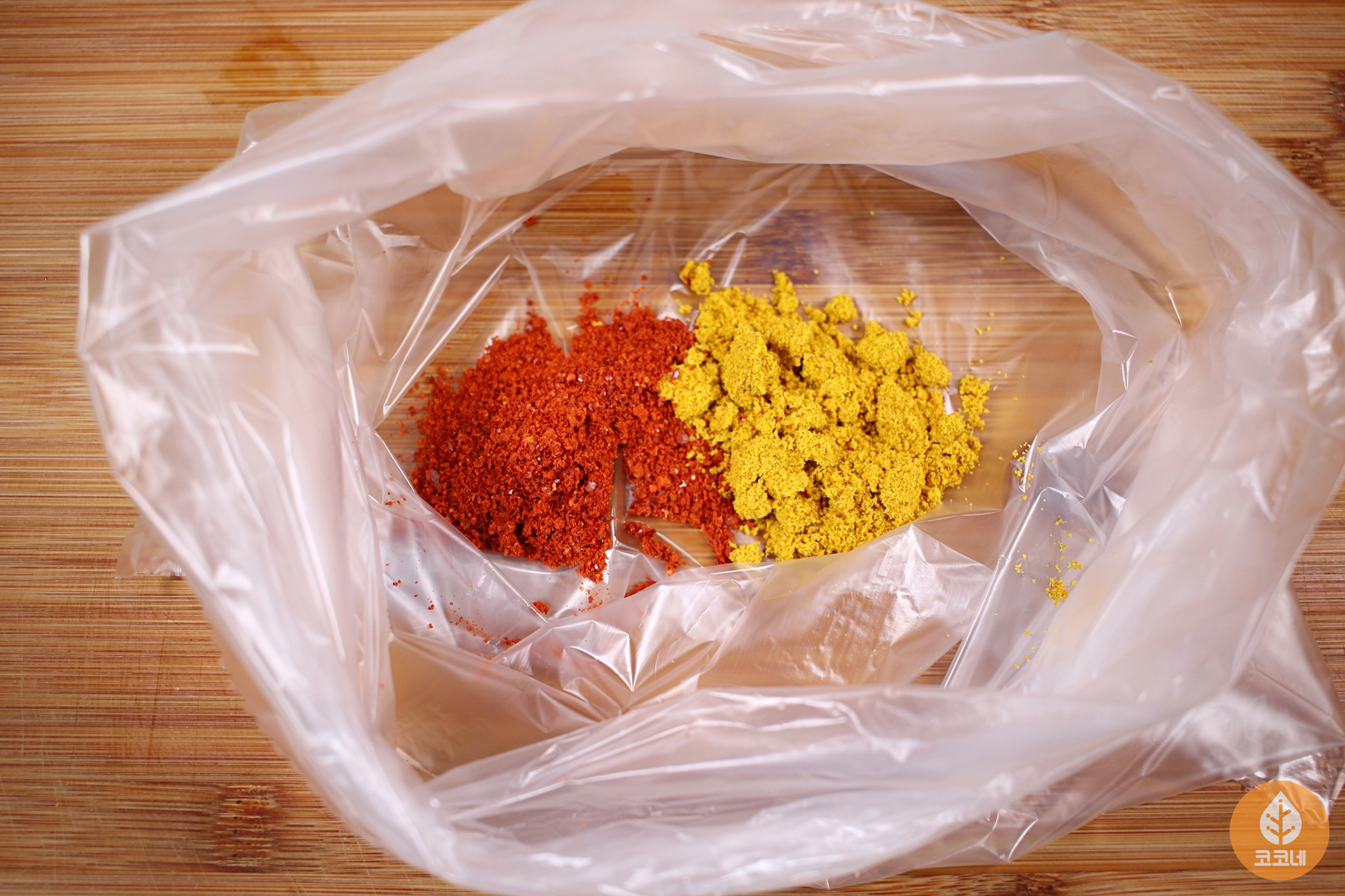깨끗한 위생백에 카레가루1큰술, 고춧가루1큰술을 넣어서