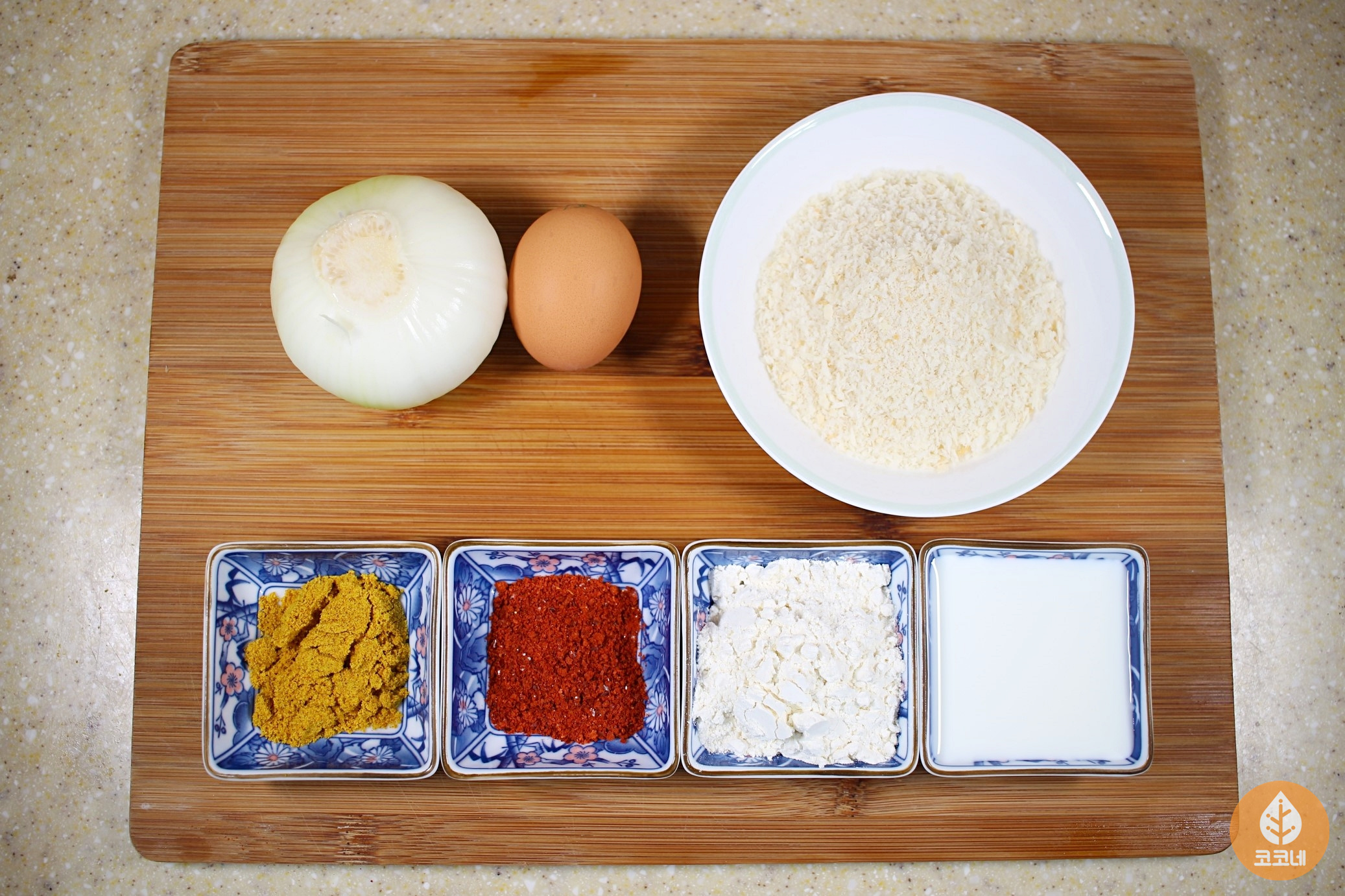 재료는 양파, 카레가루, 고춧가루, 달걀, 튀김가루,