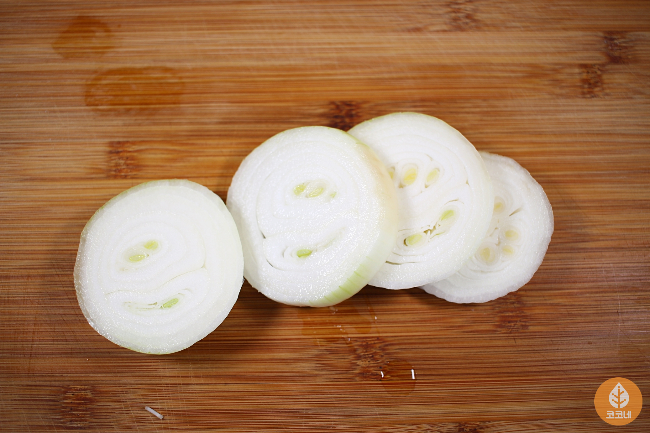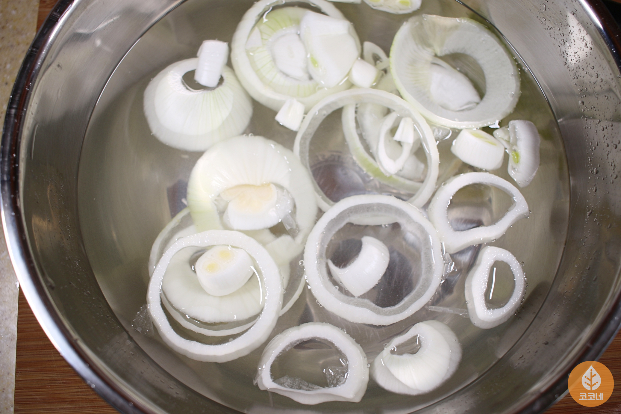 동그랗게 썬 양파를 찬물에 잠시 담가둘게요.