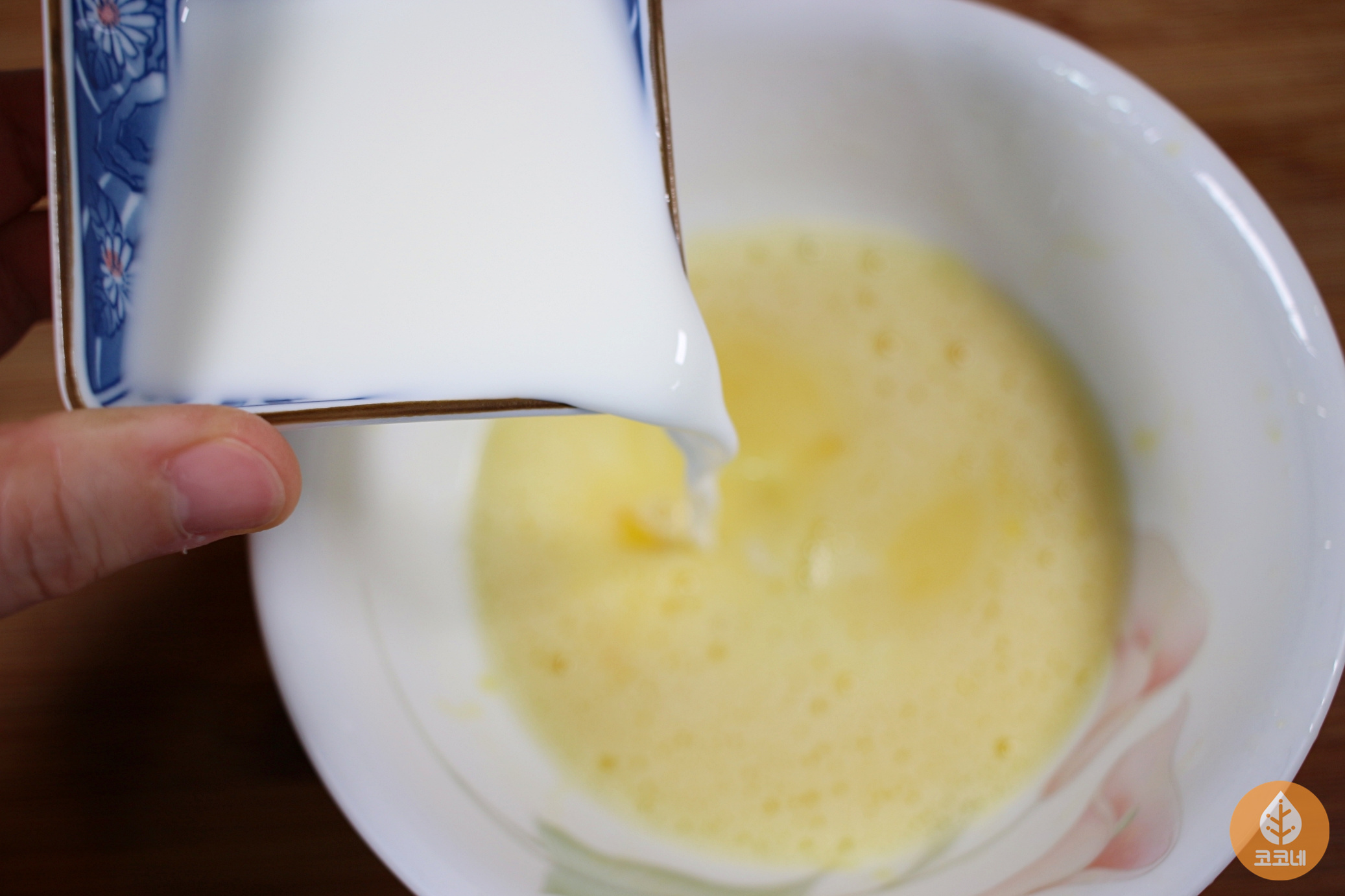 달걀1개를 곱게 풀어서 우유와 1:1로 섞어주세요.