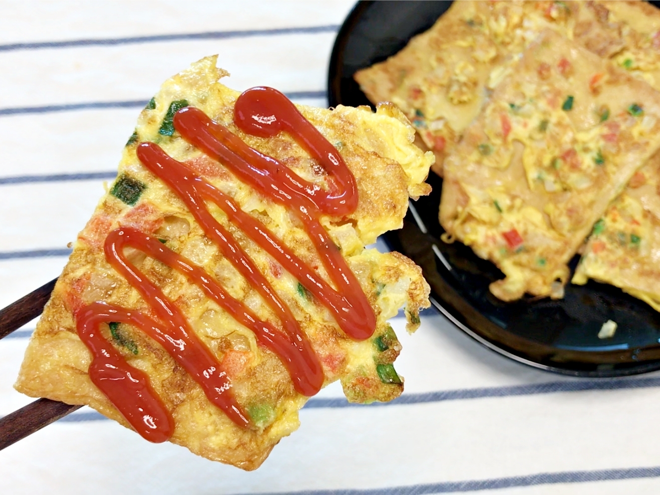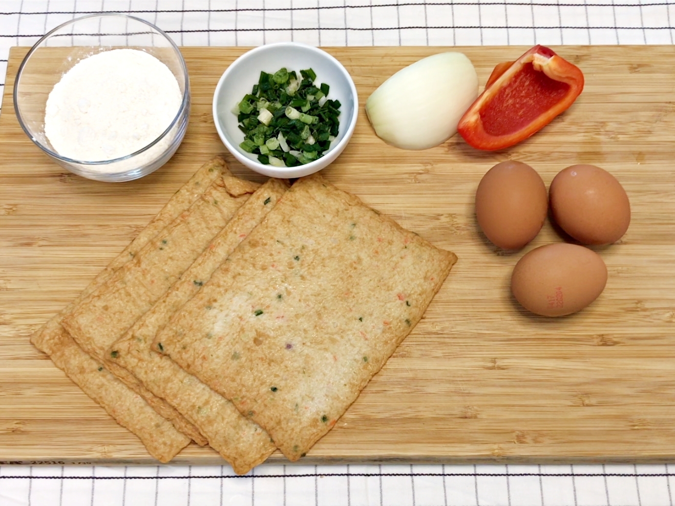 재료는 사각어묵, 달걀, 밀가루, 양파, 파프리카, 쪽파에요.
