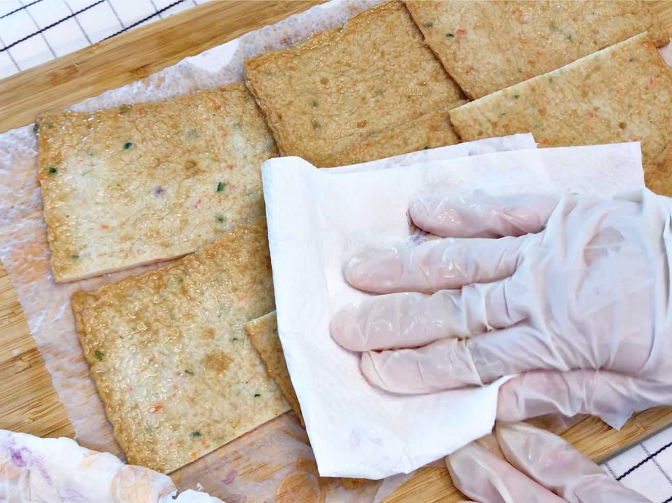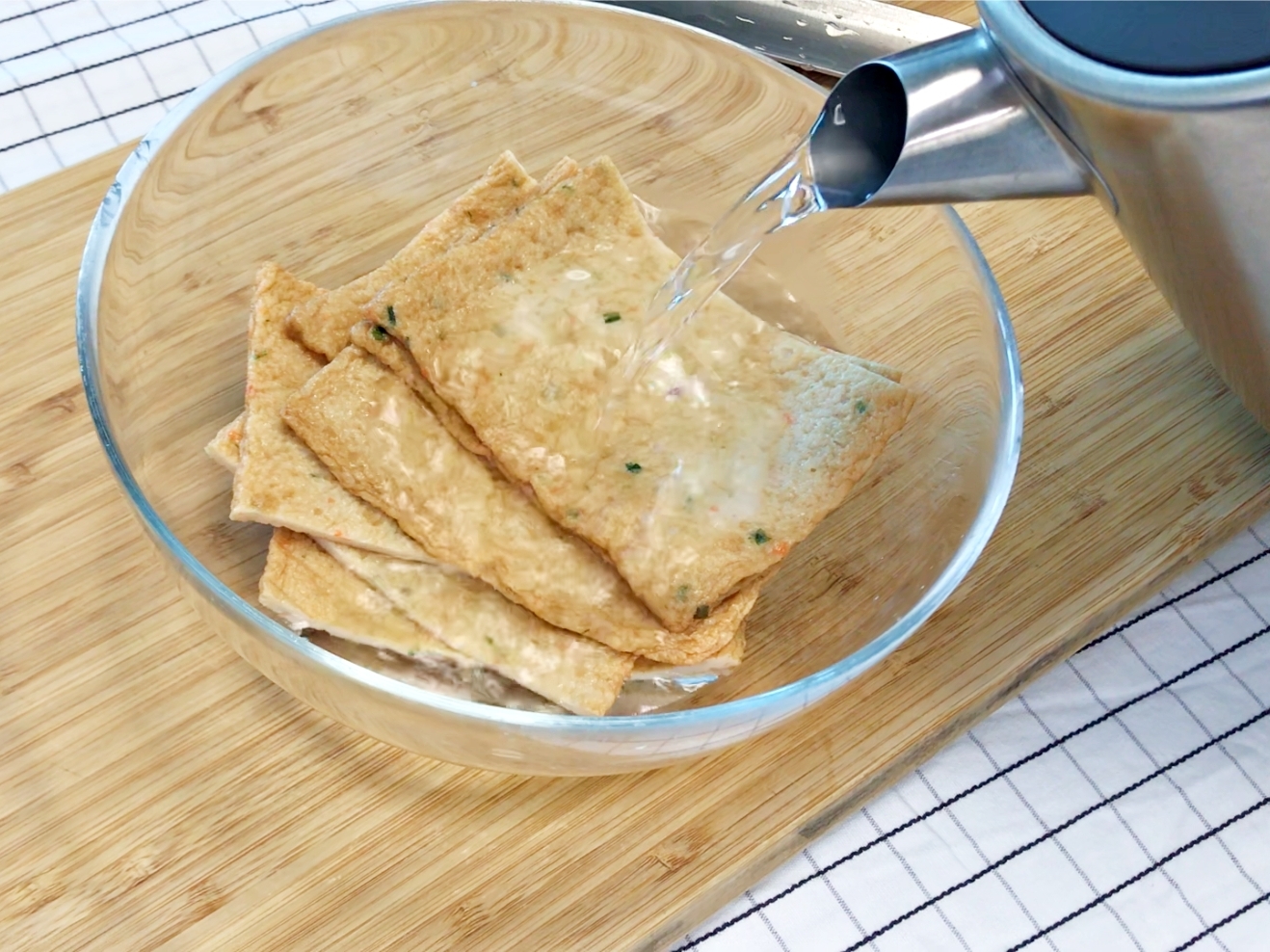 먼저 사각 어묵을 뜨거운 물에 약 5분 정도 담가주세요.