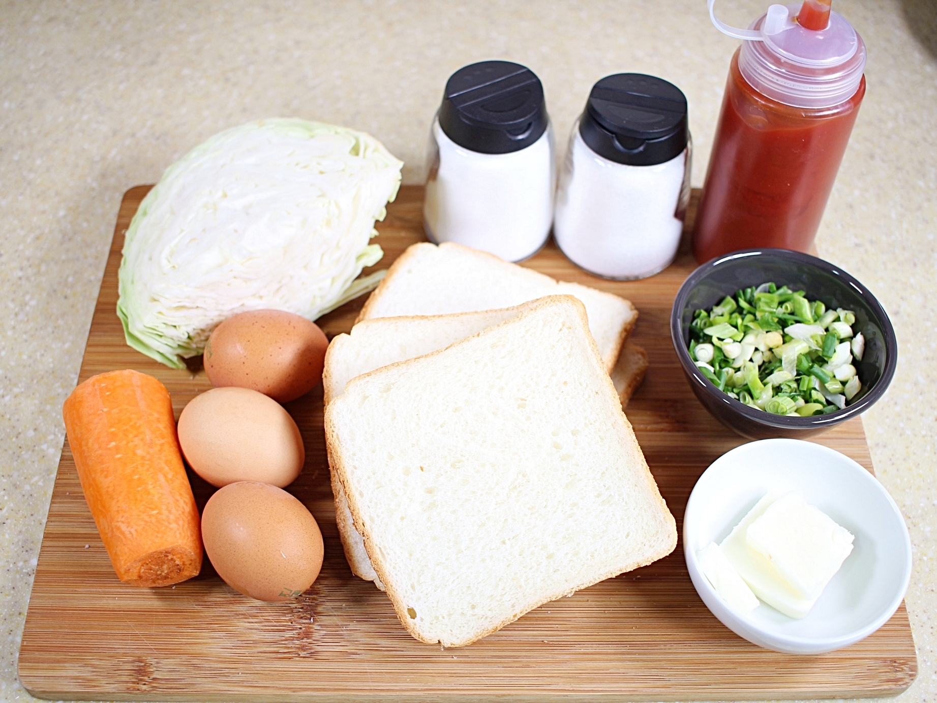 재료는 식빵, 계란, 양배추, 당근, 쪽파,
