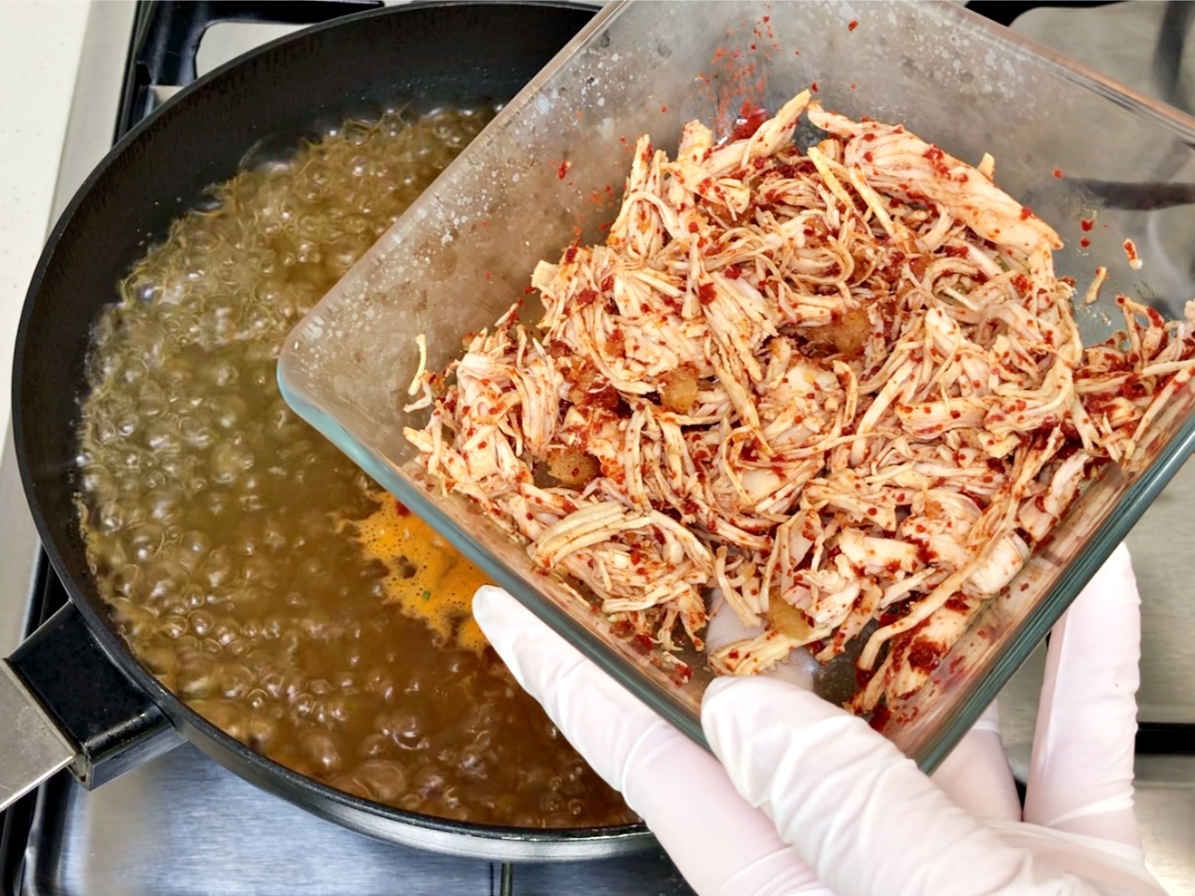 미리 양념해둔 닭가슴살을 바로 투입해 함께 끓여주세요.