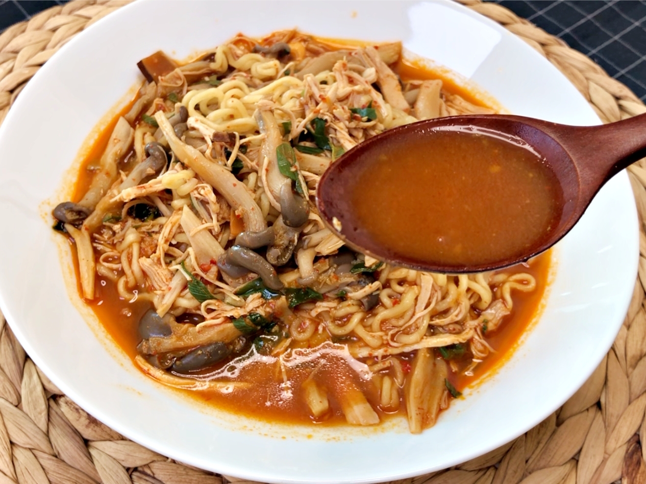 인스턴트 라면으로 끓여냈지만 감칠맛이 부족하지 않고요.