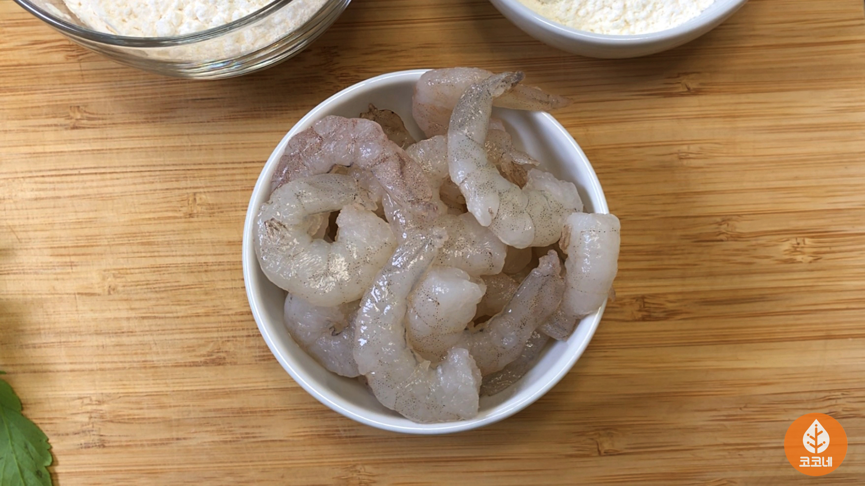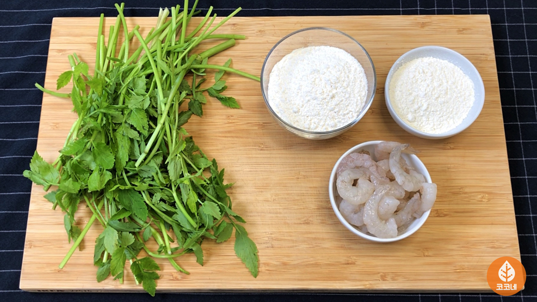 만들어놓은 반죽에 손질한 미나리와 새우 넣고