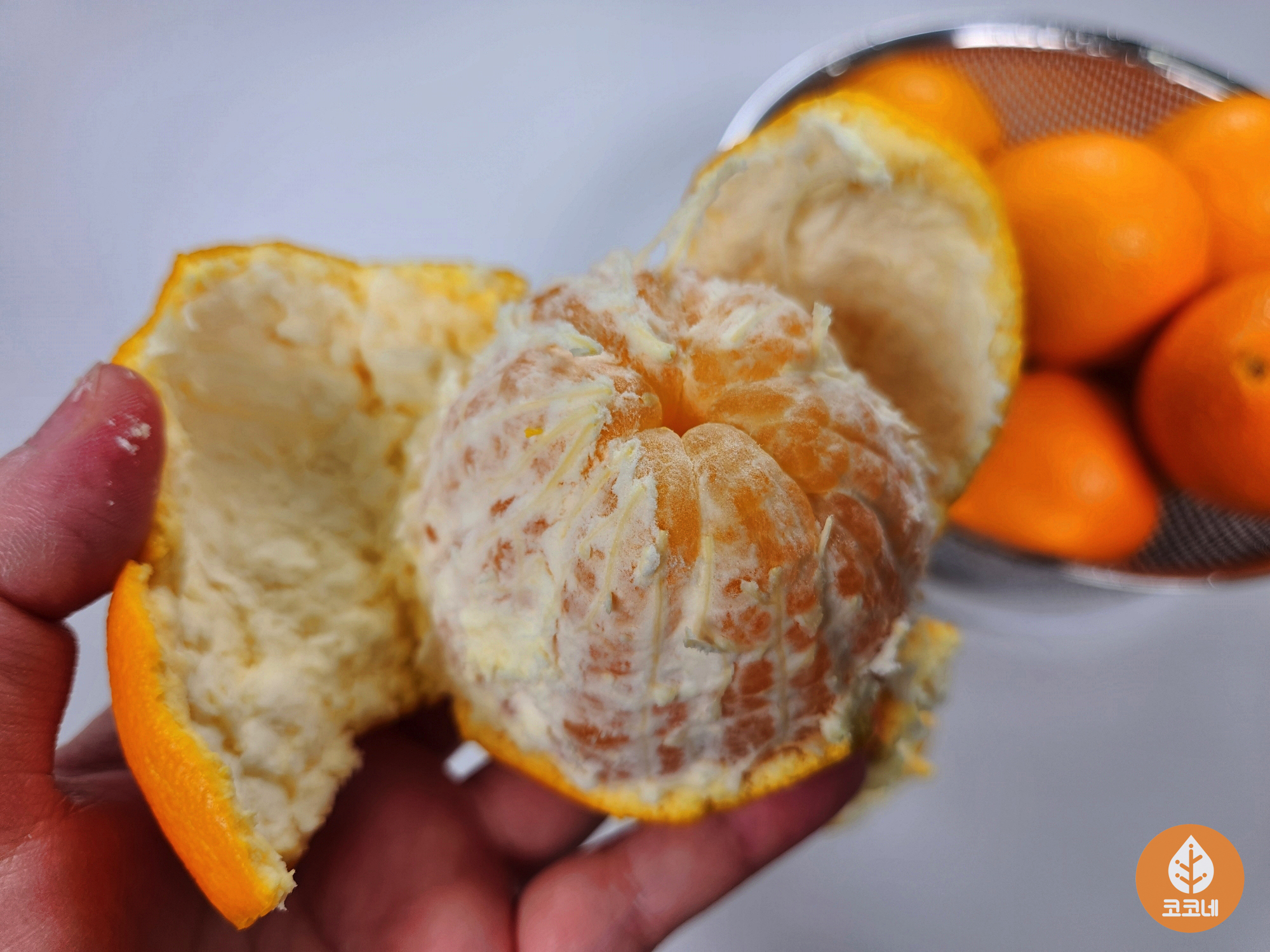 식용왁스가 묻어 있는 상태로 오렌지 껍질을 까면