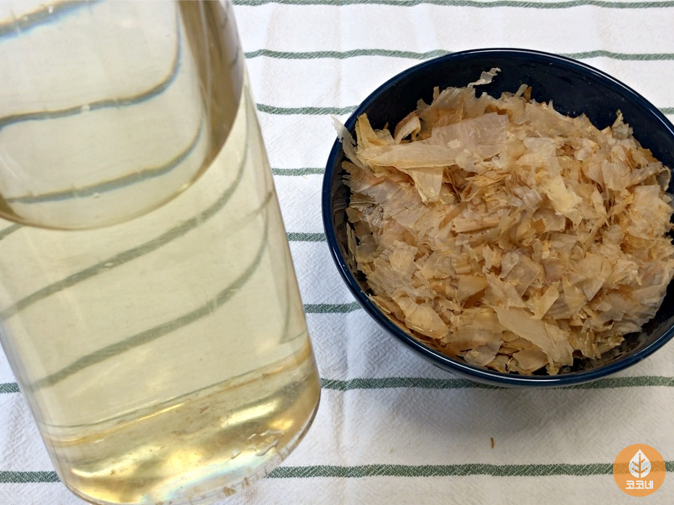한김 식힌 물에 가쓰오부시로 육수를 나면