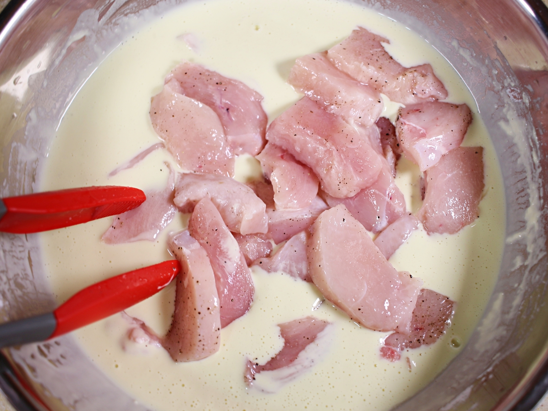 닭고기에 튀김옷 반죽을 입히고