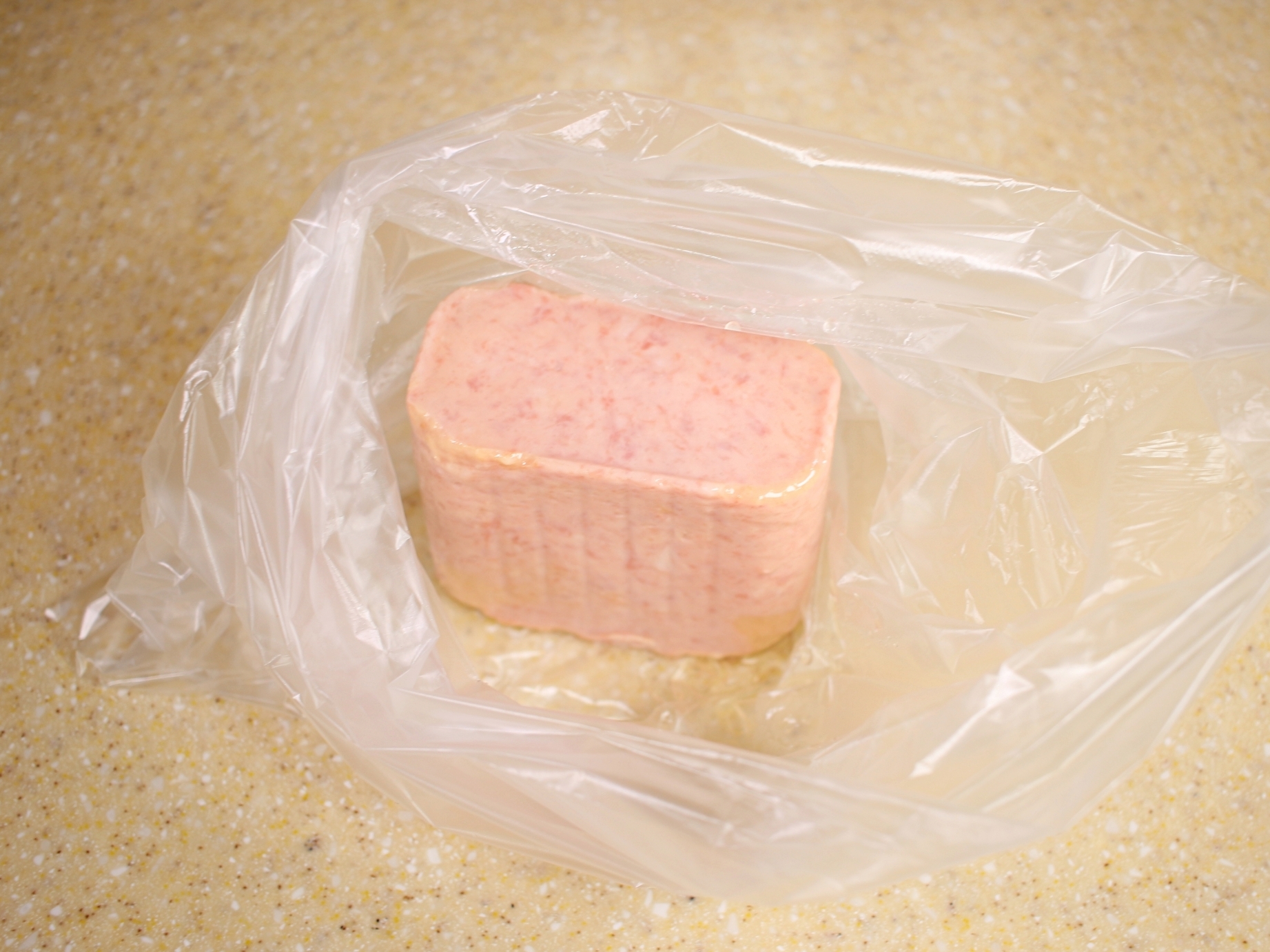 위생백에 스팸을 넣고 손바닥으로 꾹꾹 눌러주면