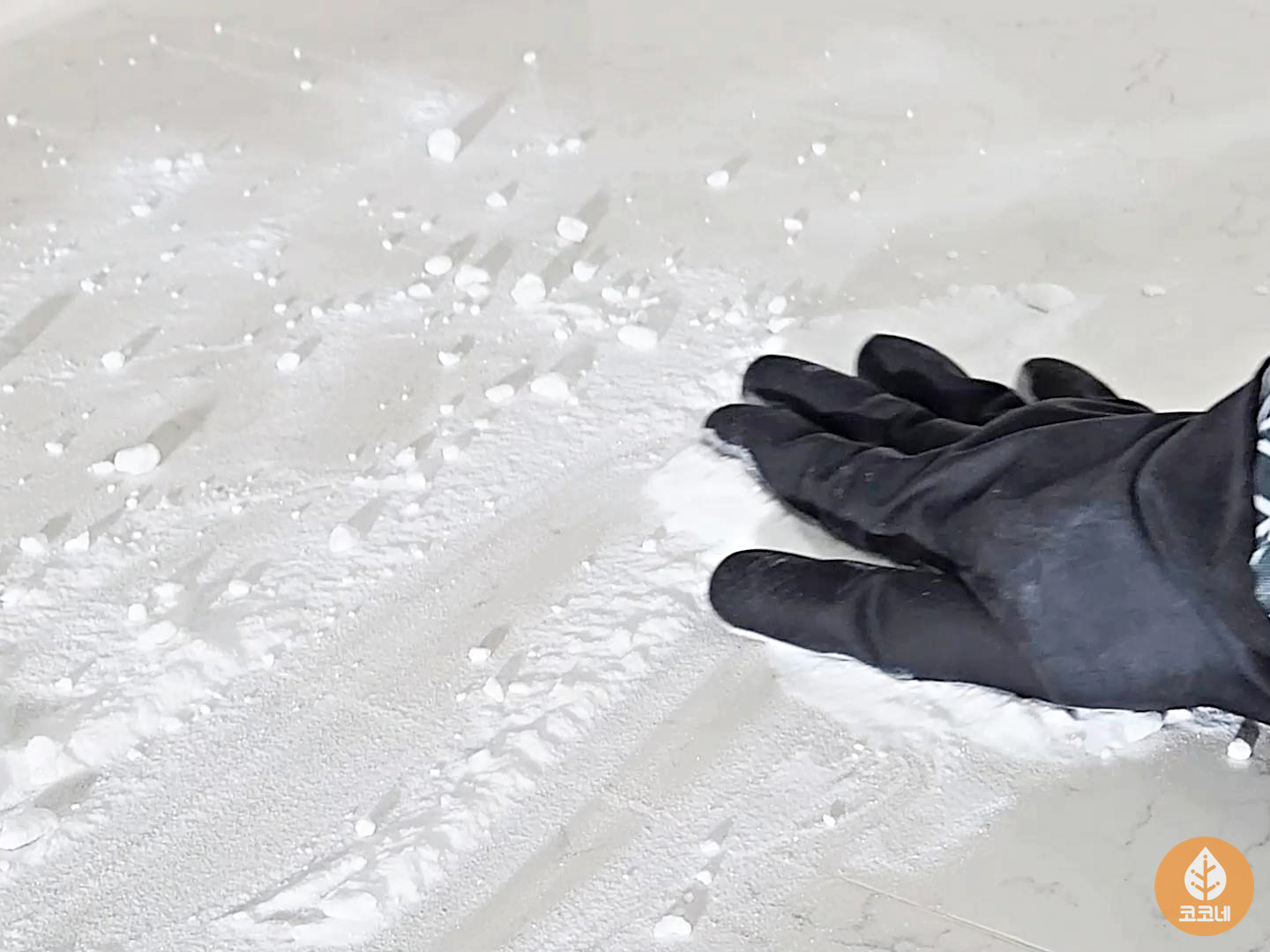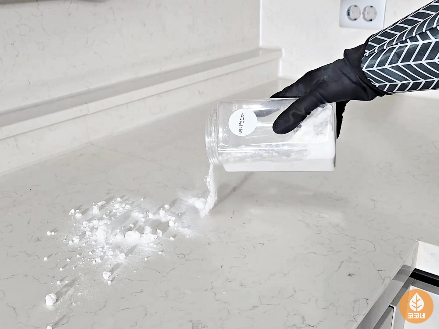 싱크대상판에 베이킹소다를 골고루 뿌리고요.