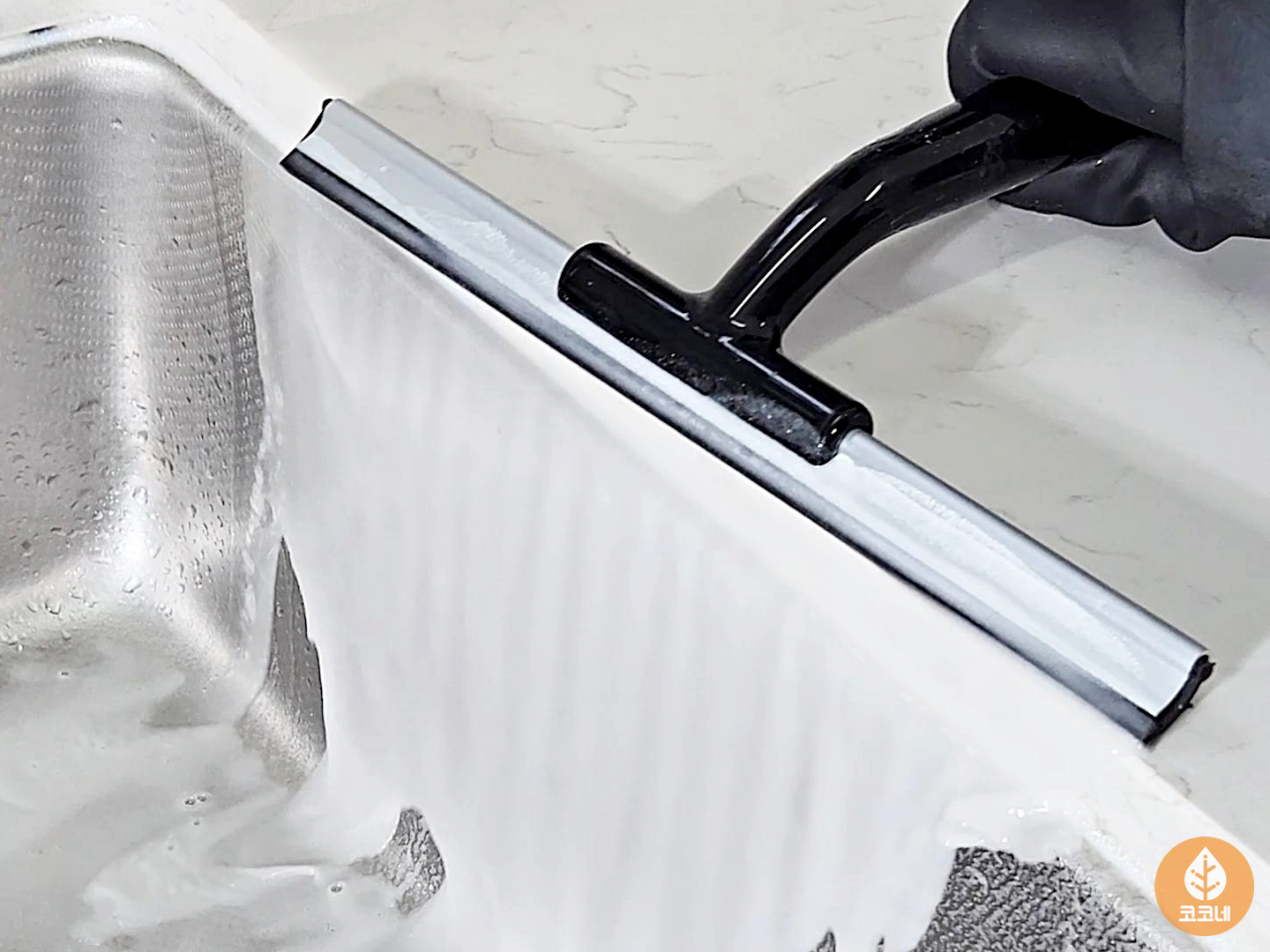 스퀴즈로 더러워진 세제물을 싱크볼로 흘려보내고요.