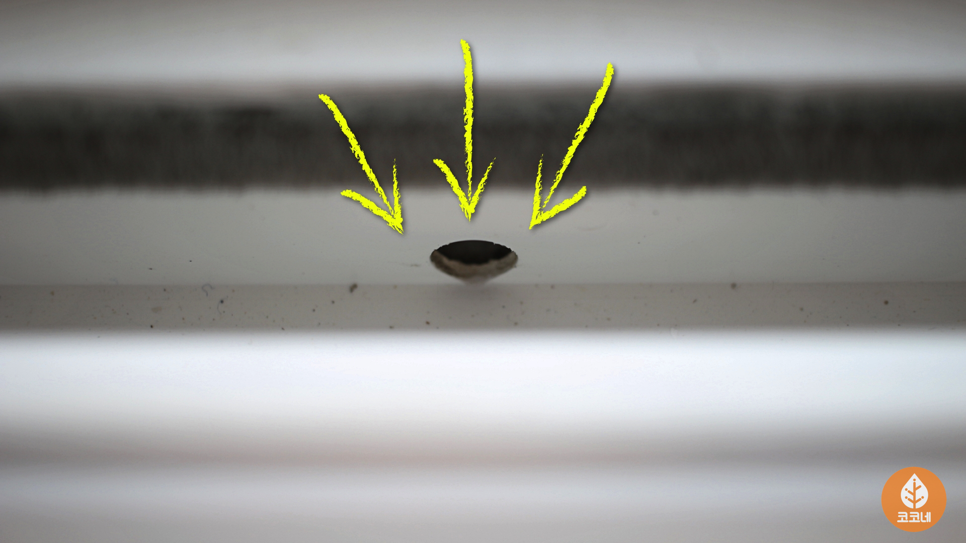 창틀에는 물이 빠지는 작은 구멍이 있어서