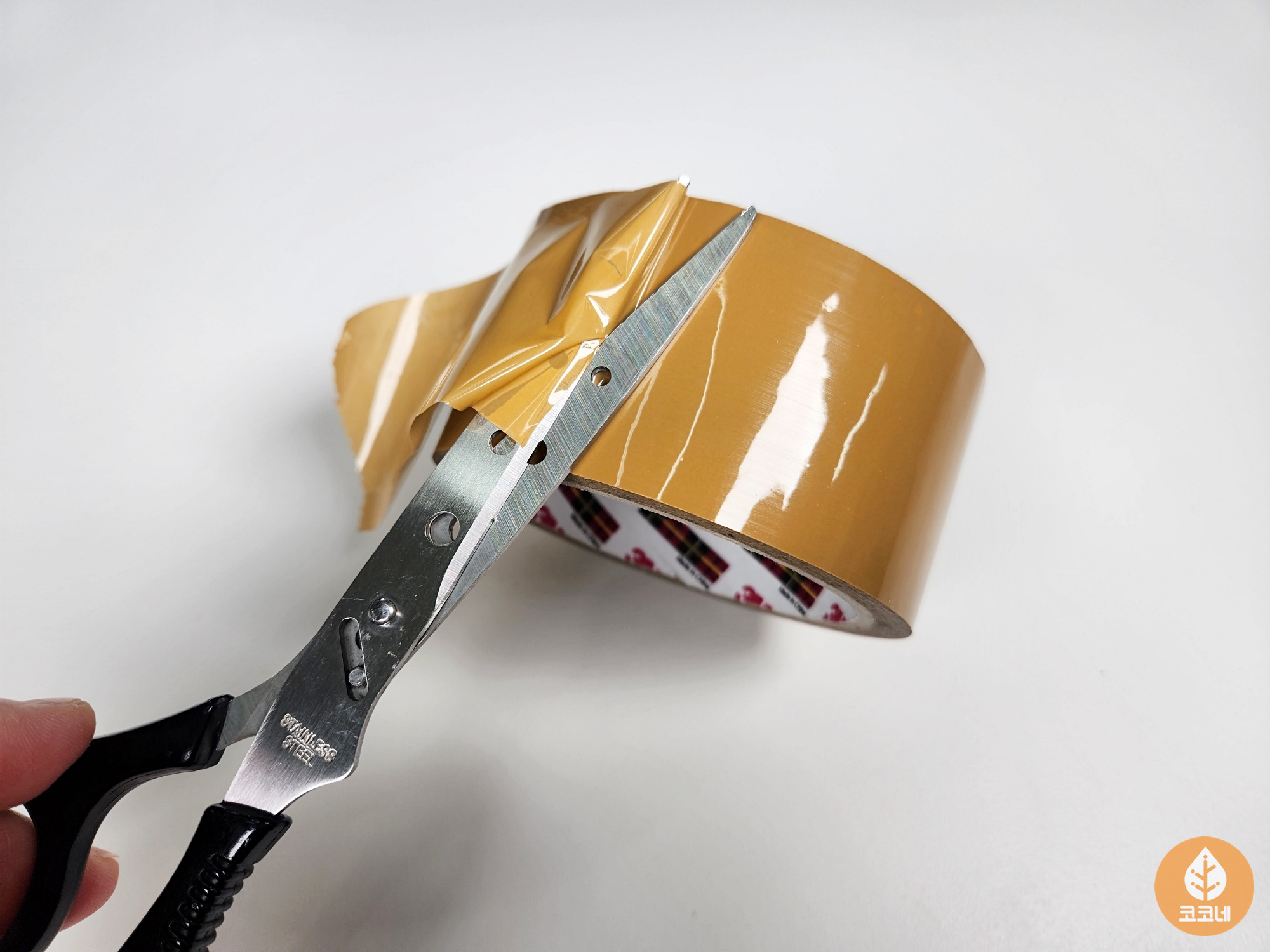 테이프를 자른 칼이나 가위에