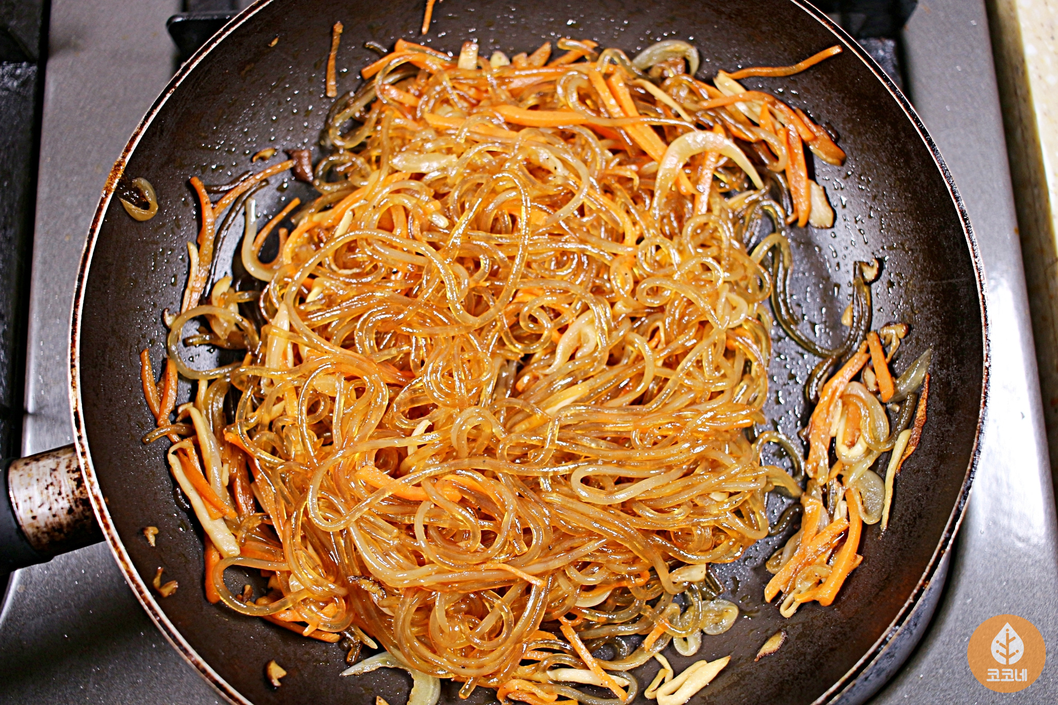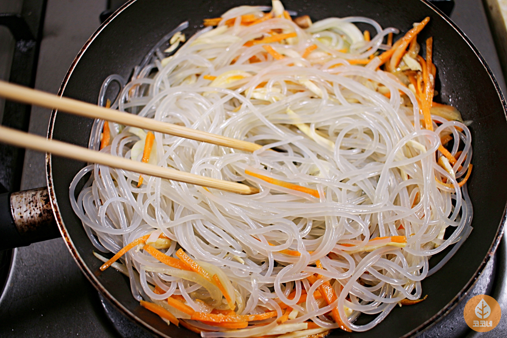 완성된 잡채는 가위로 짧게 잘라주시면 돼요.