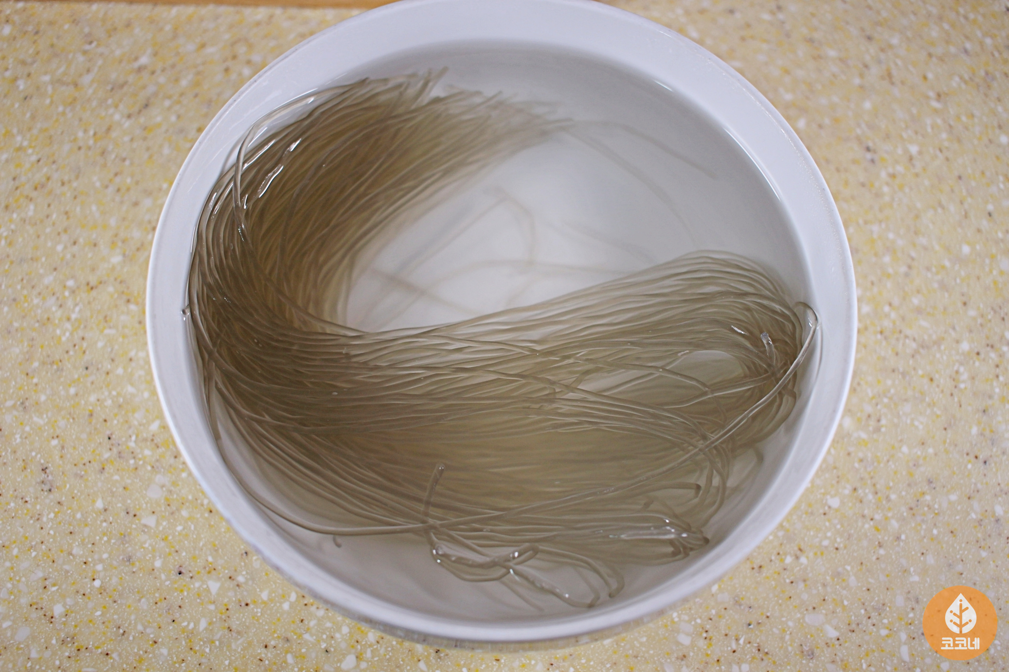 당면을 뜨거운 물에 담가 한시간정도 불려주세요.