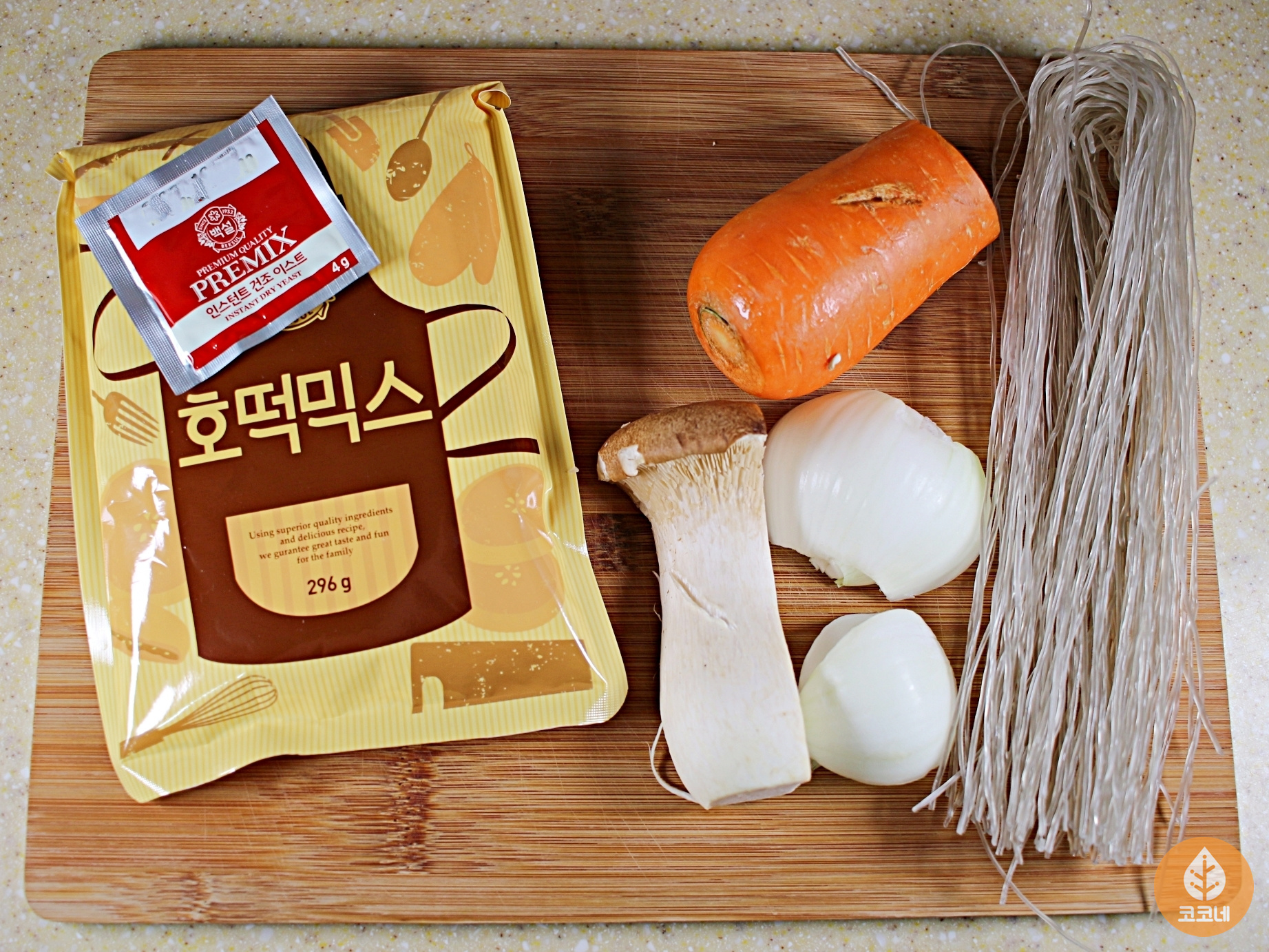 재료는 호떡믹스, 당면, 양파, 당근, 버섯 준비했고요.