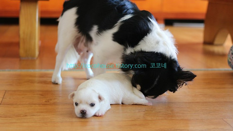 ▼엄마앞에서 애교부리는 딸래미가 귀여웠는지 코코가 보름이를 핥아주네요.