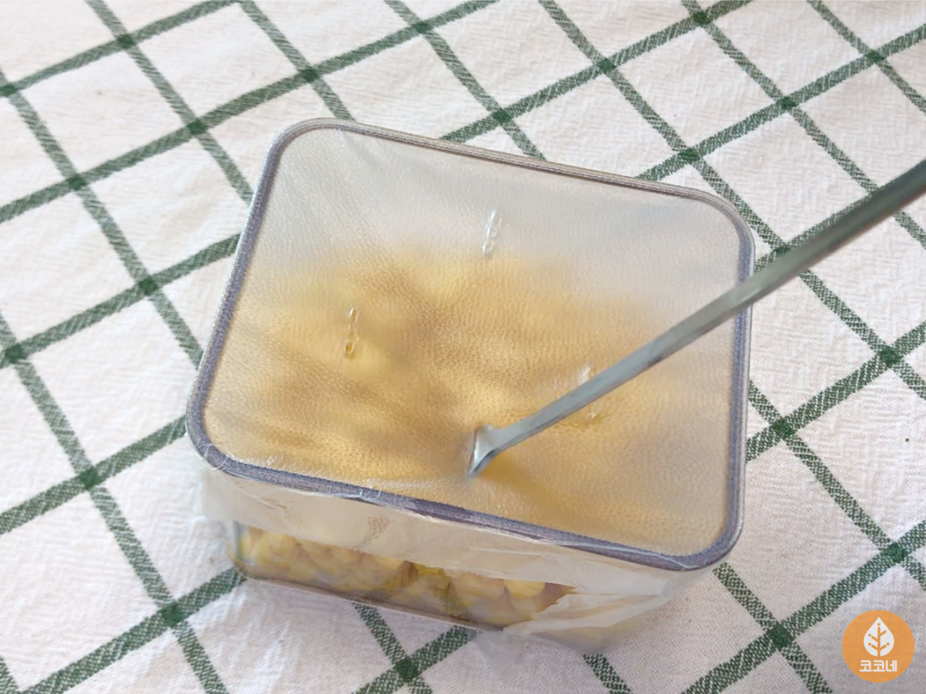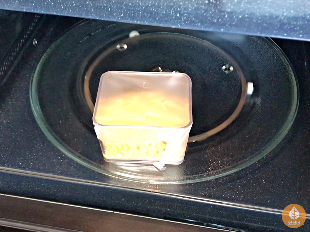 내열용기에 남은 캔옥수수를 담아 랩을 씌우고