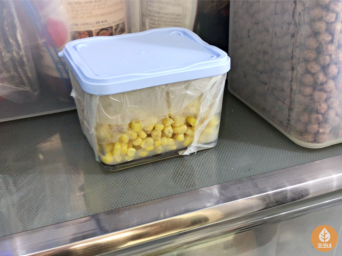 내열용기에 남은 캔옥수수를 담아 랩을 씌우고