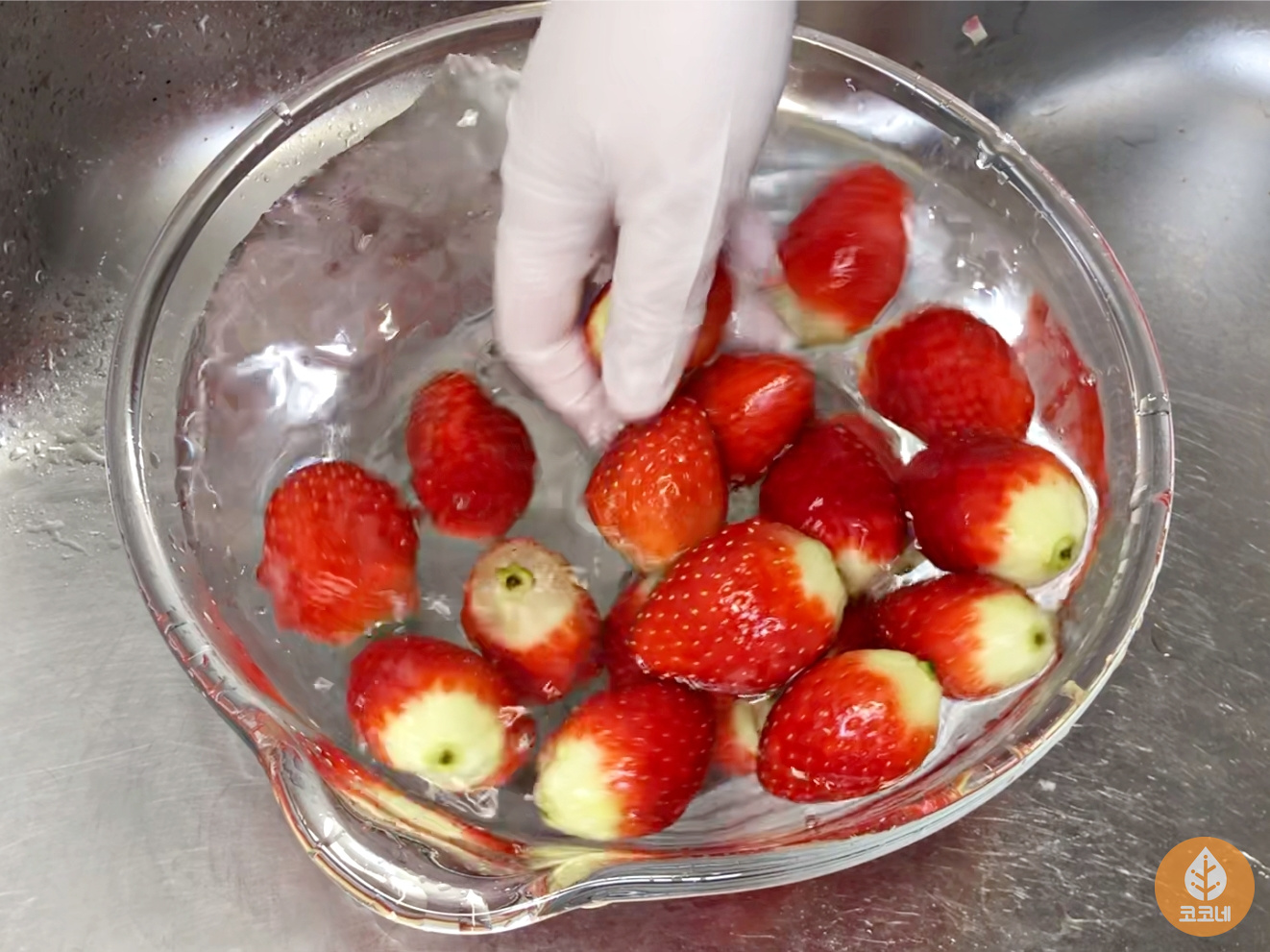 꼭지를 제거한 딸기를 물에 담가 씻을건데요.
