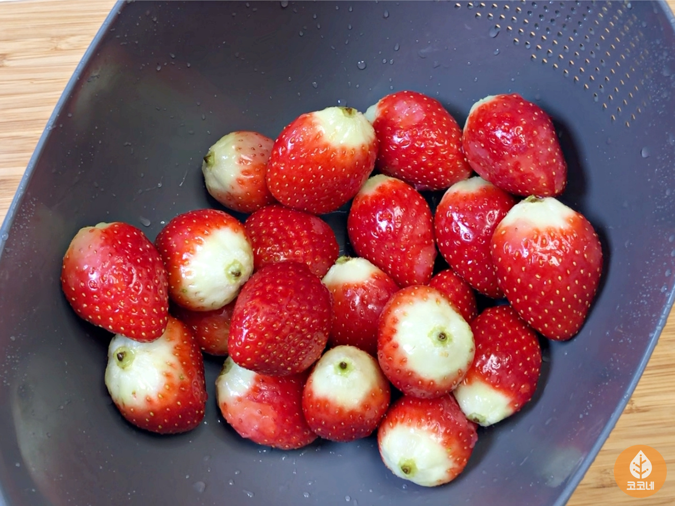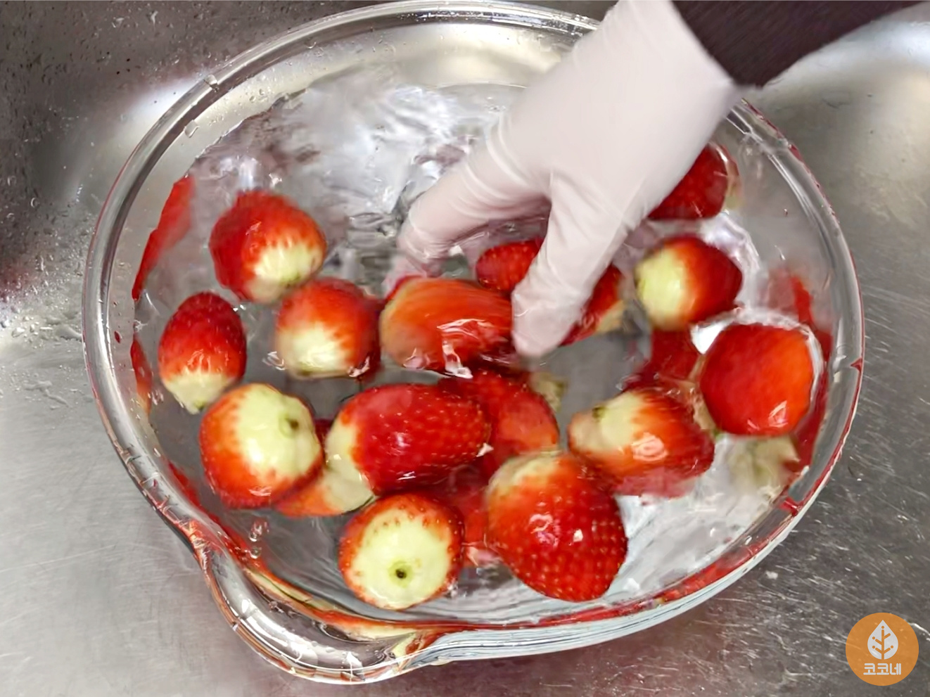 꼭지를 제거한 딸기를 물에 담가 씻을건데요.