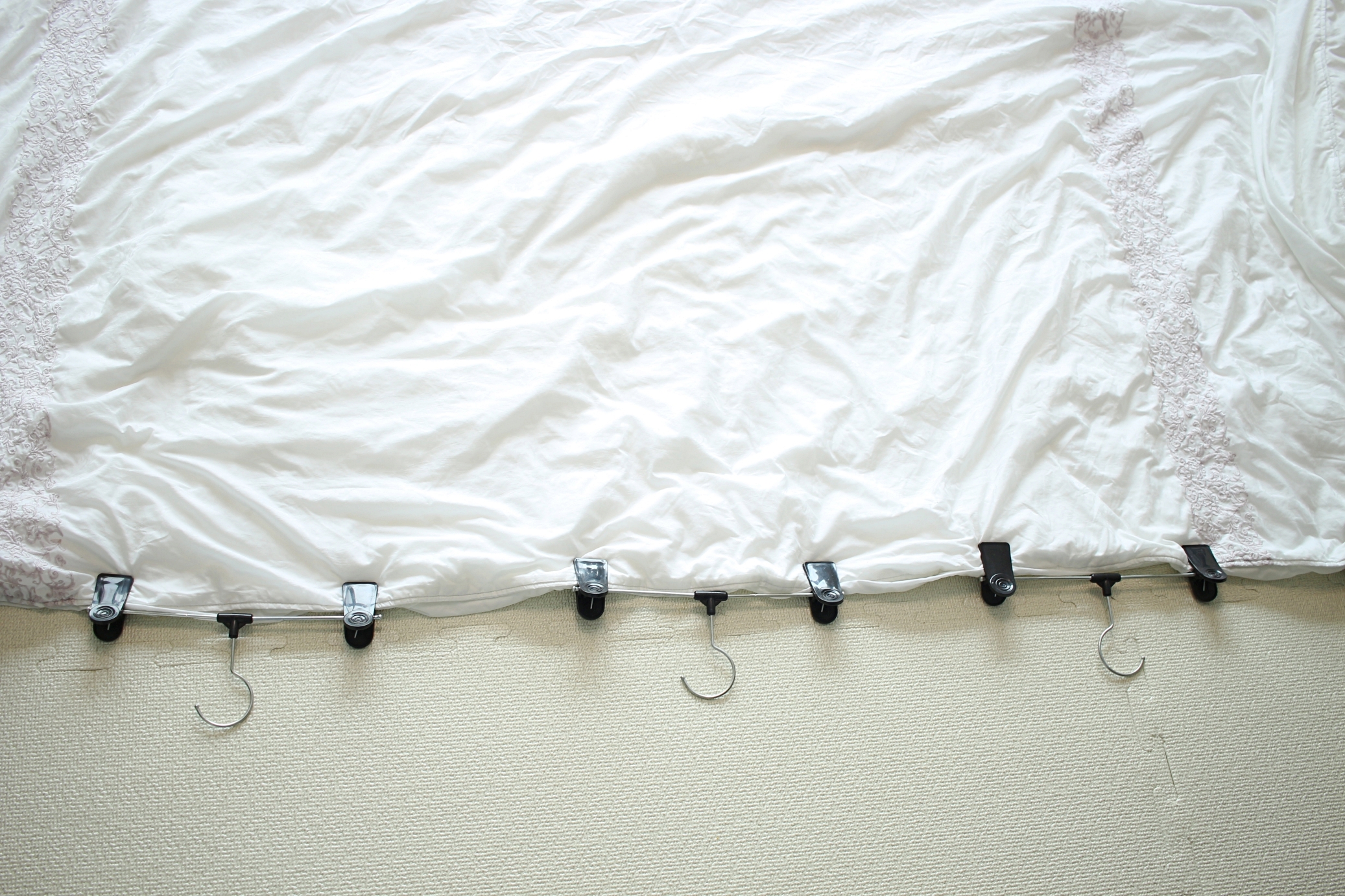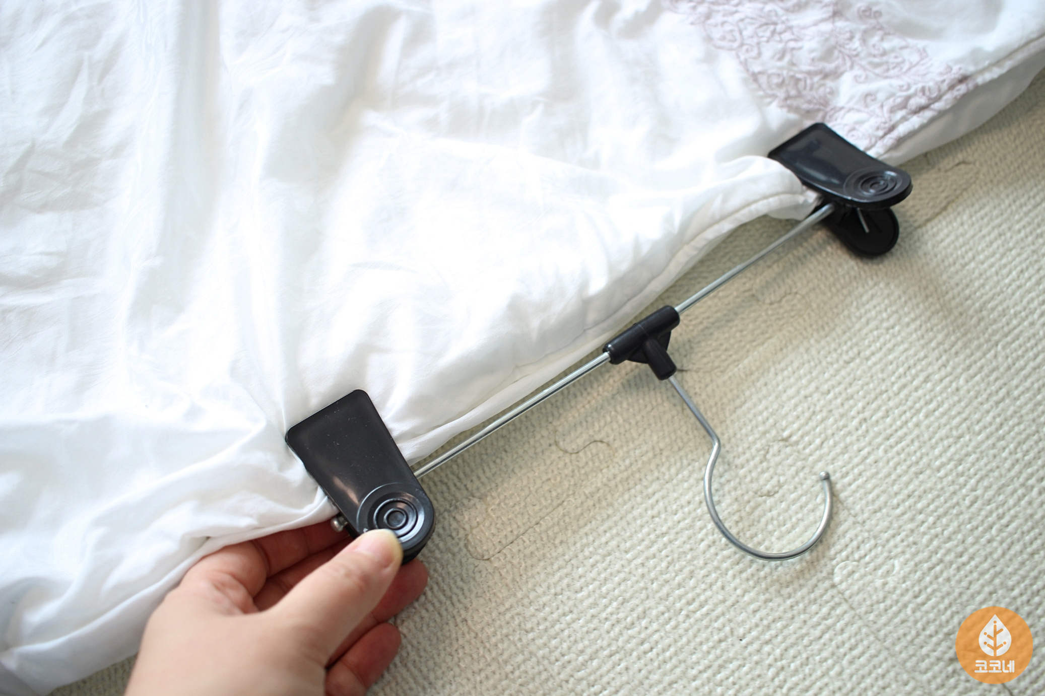 이불이 거치된 바지걸이를 압축봉에 걸기만 하면 끝!