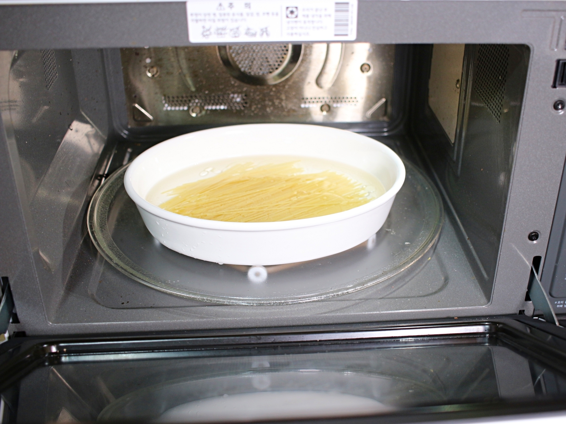 전자레인지 사용 가능한 용기에 스파게티면을 담아주세요.