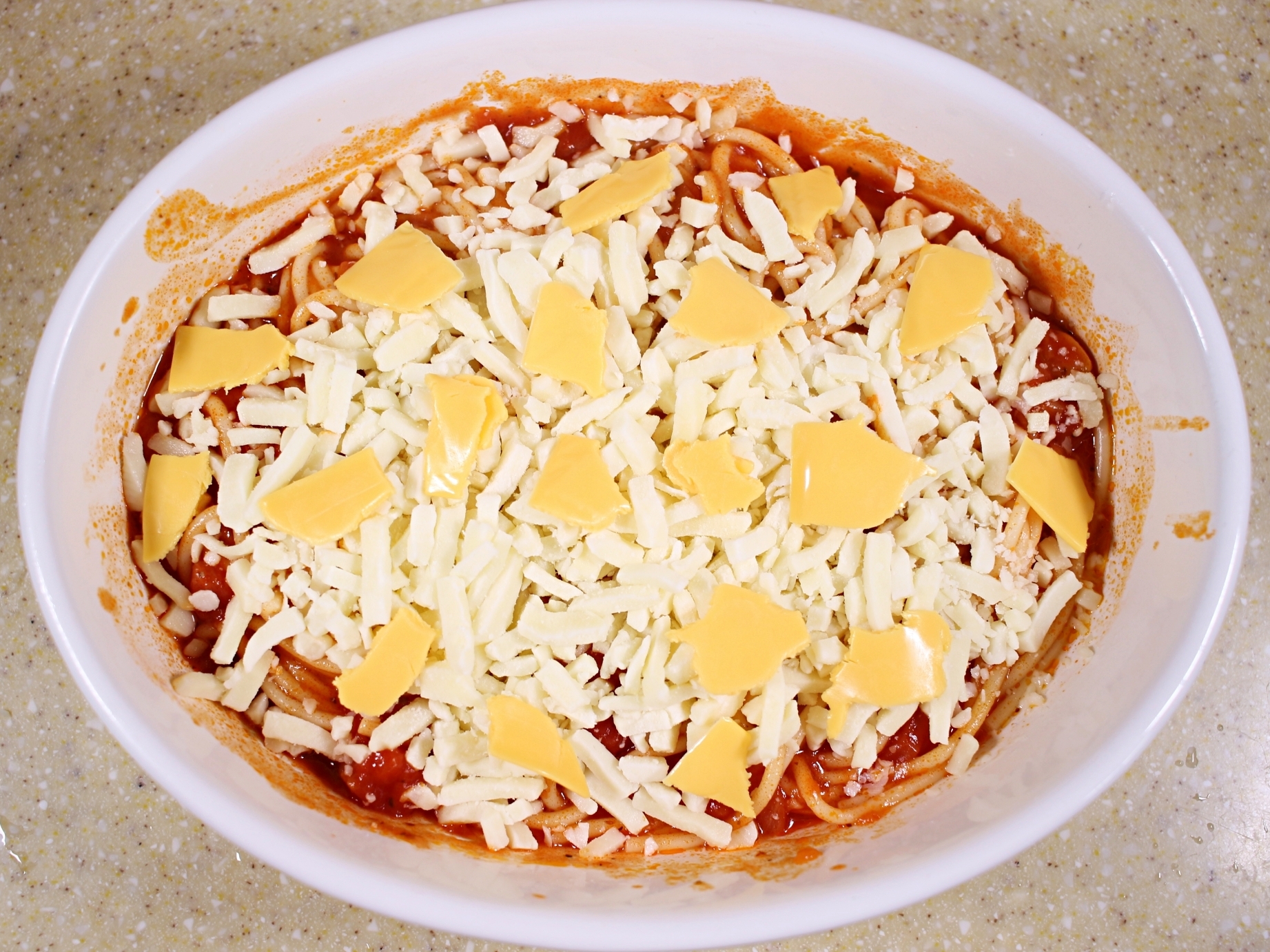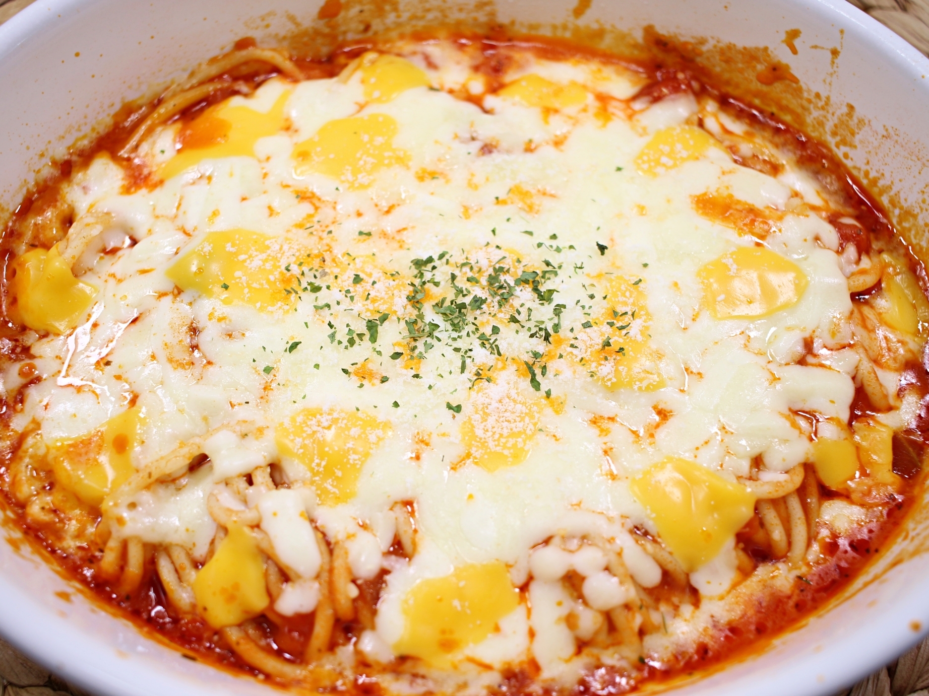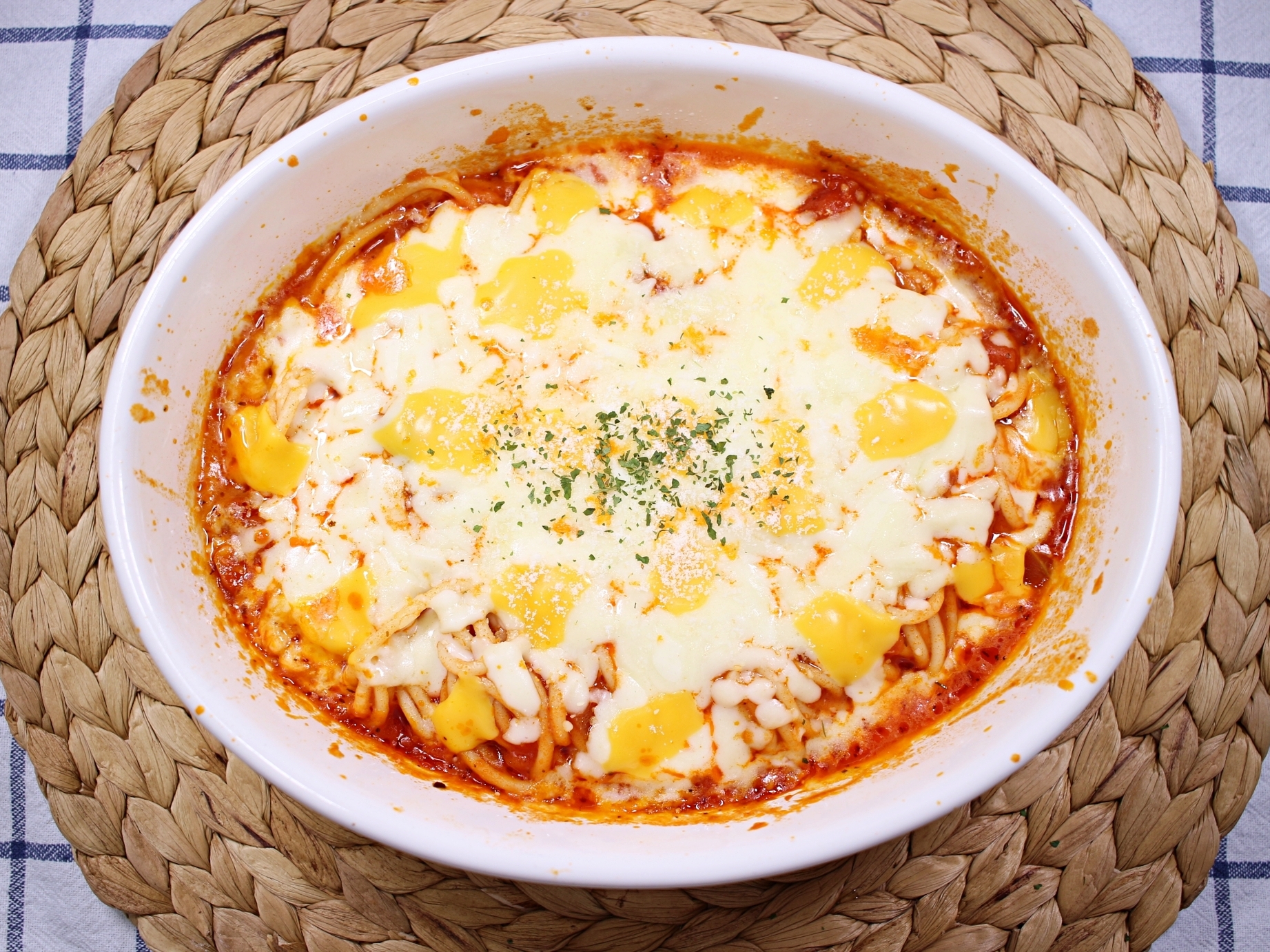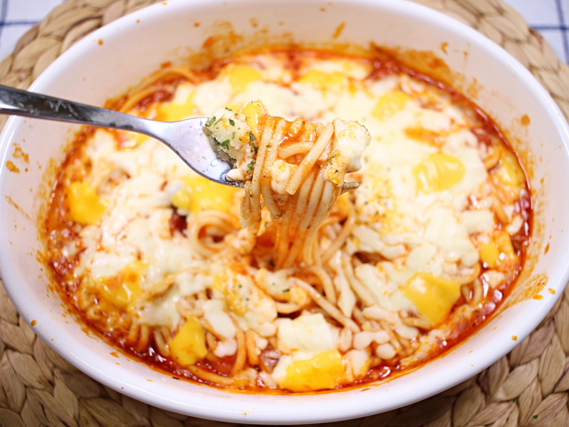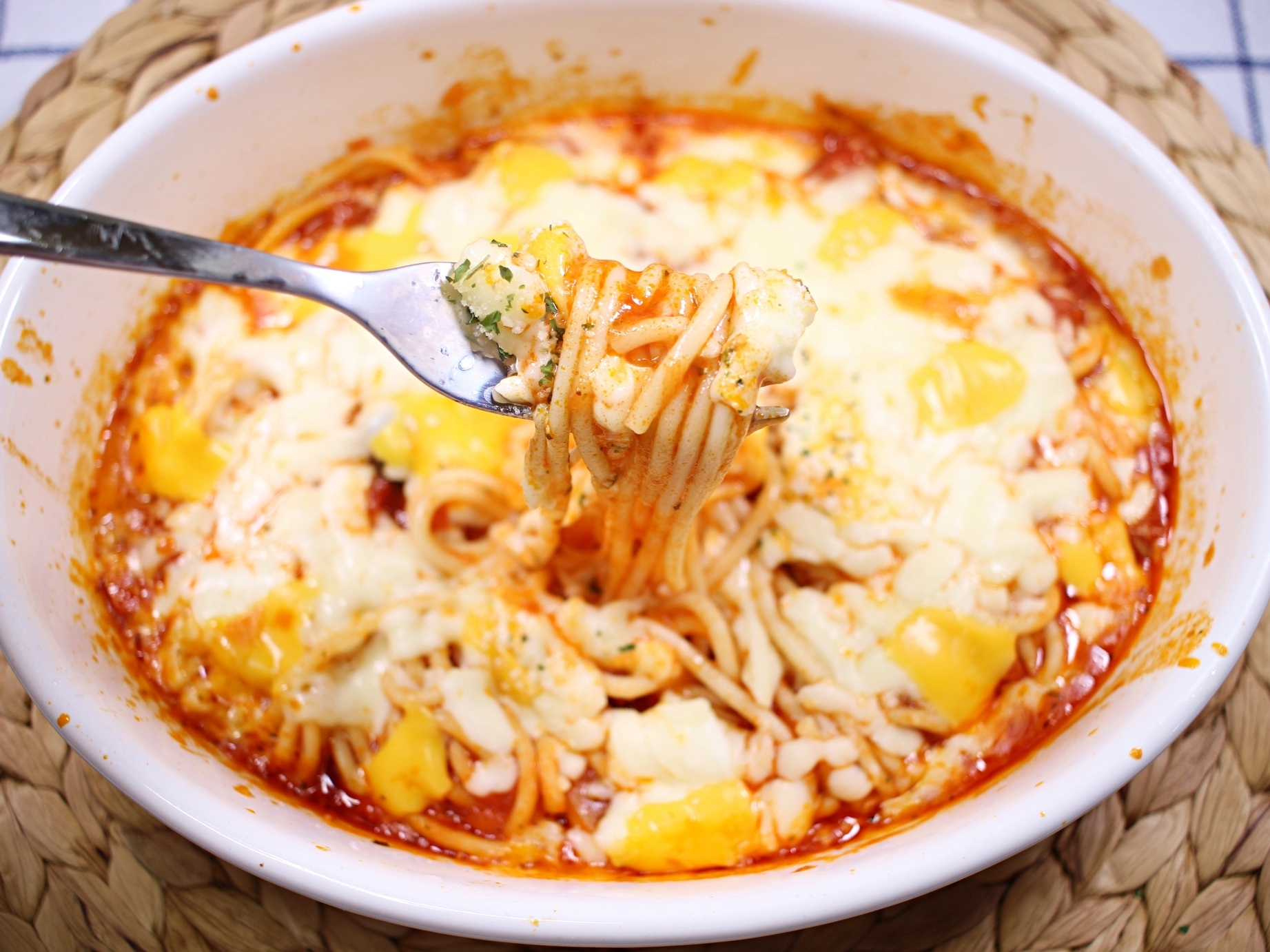 재료는 스파게티면과 소스, 모짜렐라치즈,