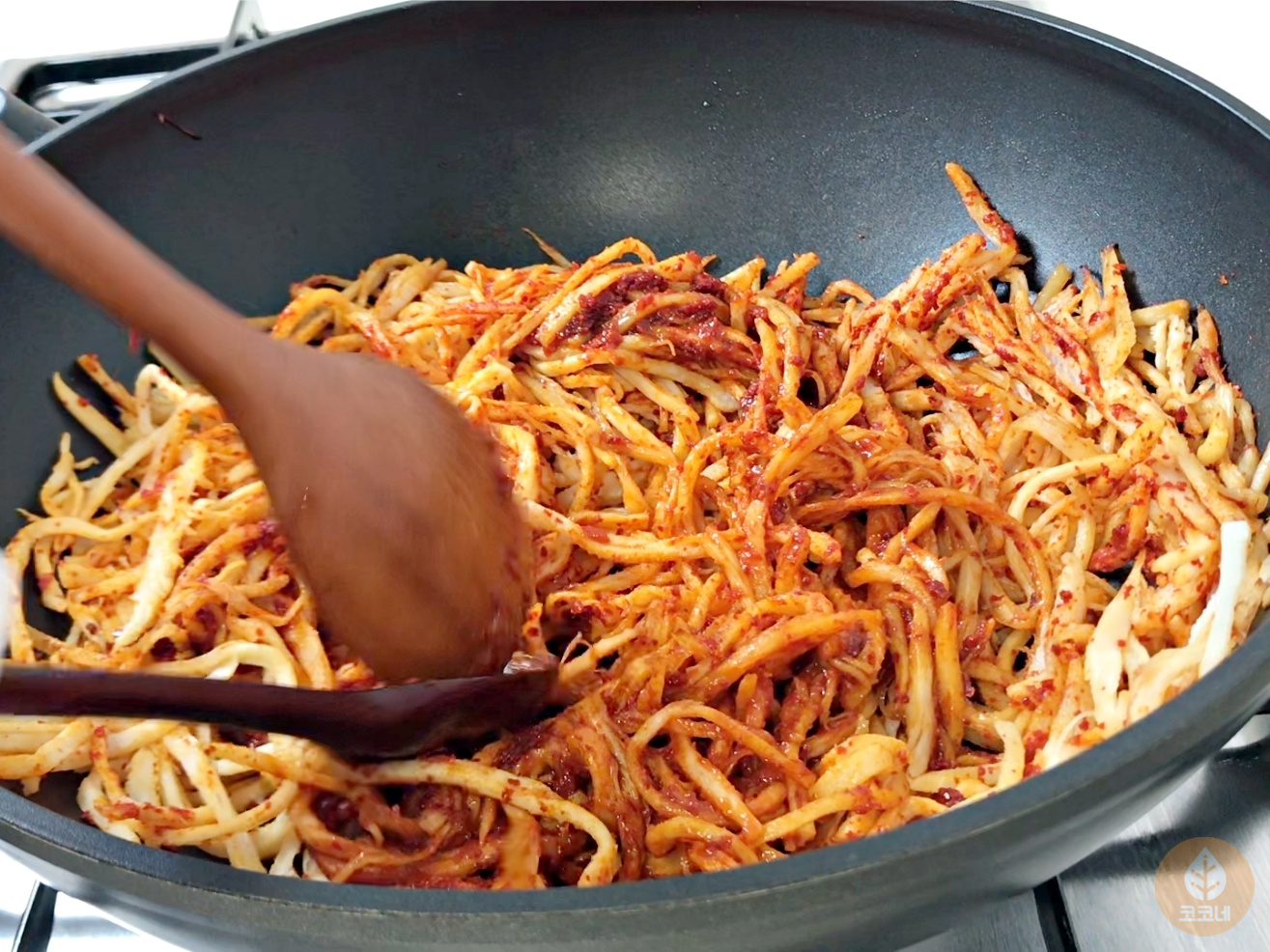 물기를 제거한 진미채 넣어서 볶아주세요.