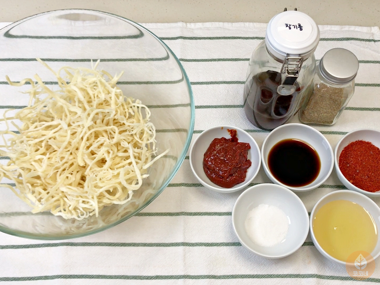 재료는 진미채400g, 고추장, 간장, 고춧가루, 올리고당,