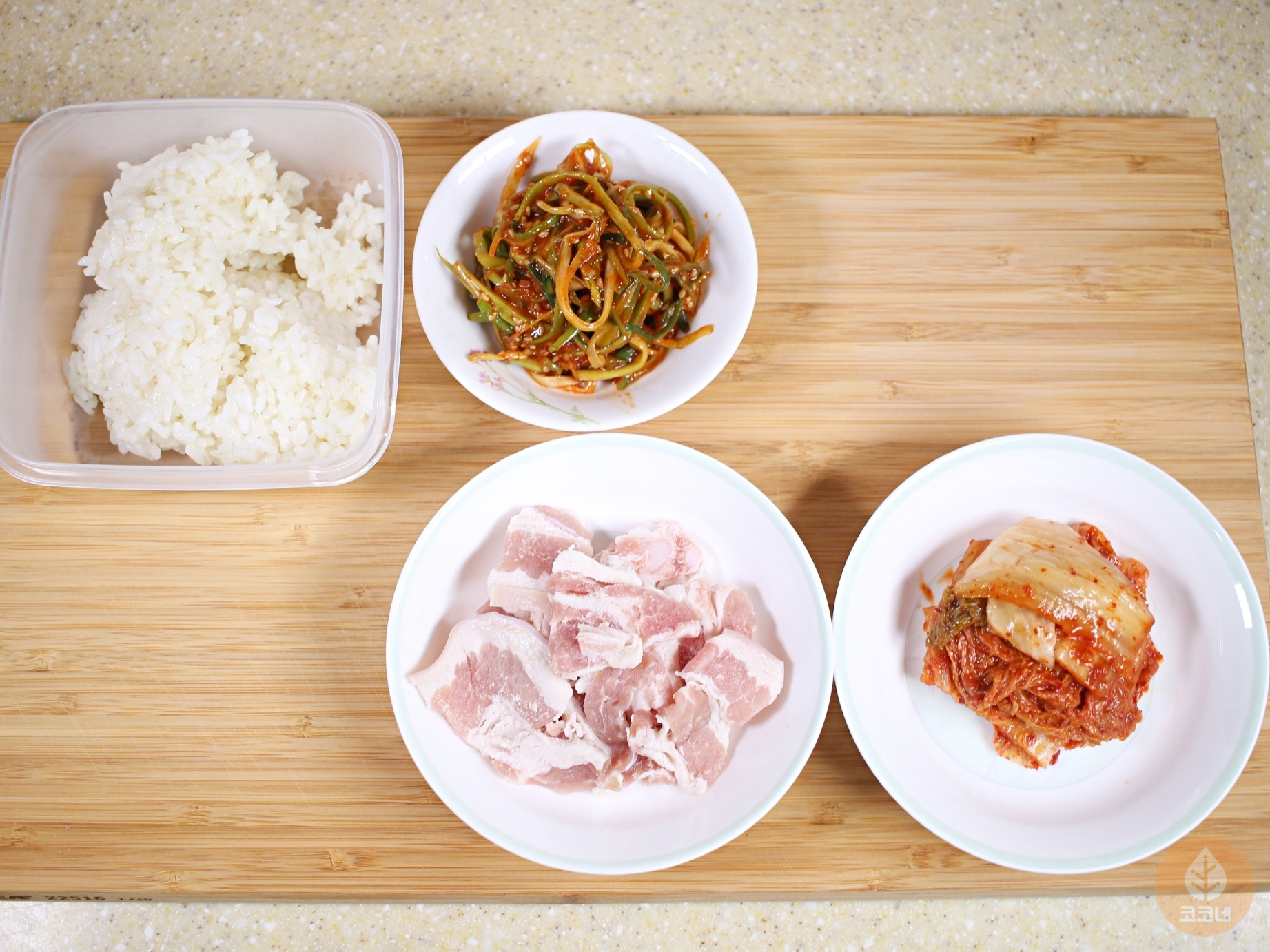 재료는 삼겹살 몇 조각, 파무침, 김치, 찬밥 준비했어요.