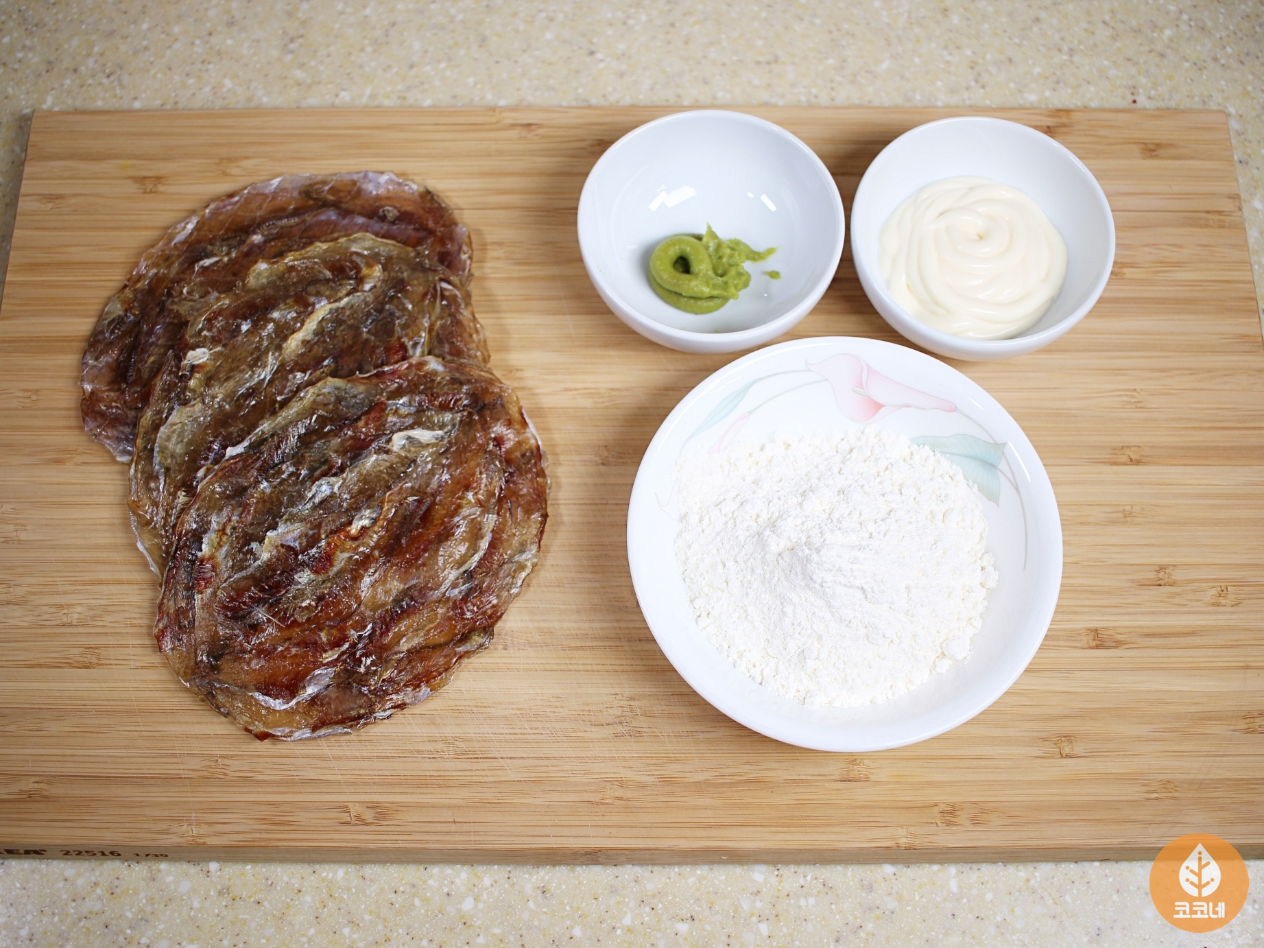 재료는 쥐포, 튀김가루, 마요네즈, 고추냉이 준비해요.