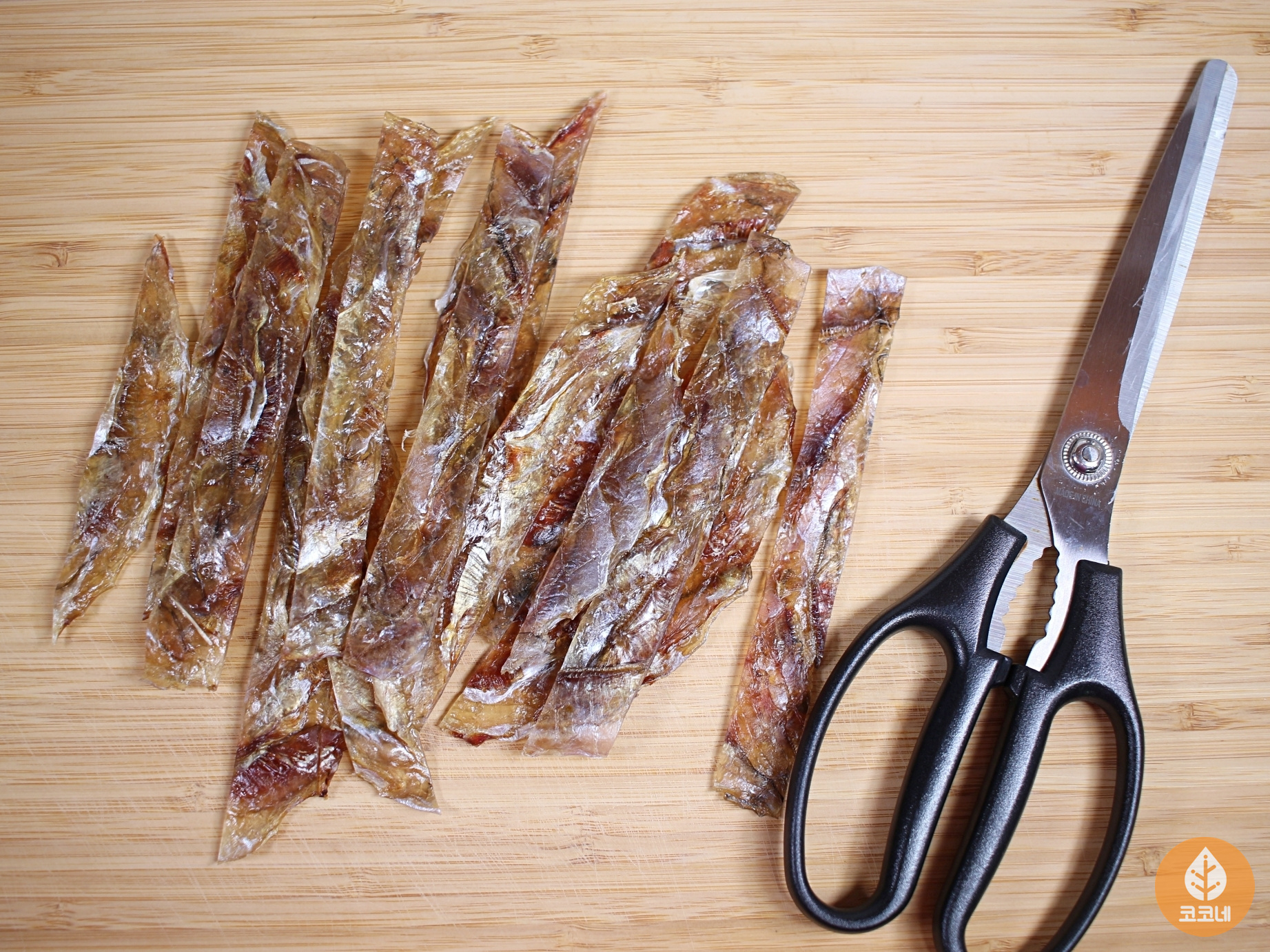 쥐포를 길쭉하게 가위로 잘라주세요.