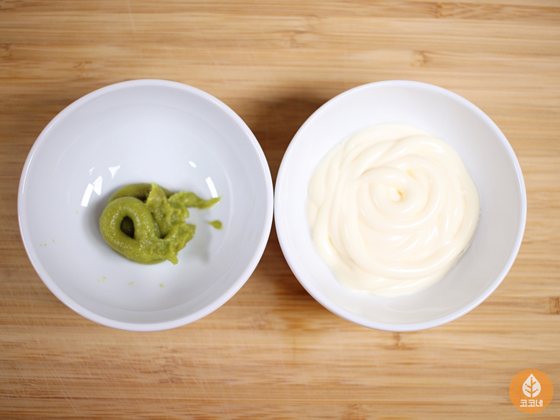 마요네즈 2큰술에 고추냉이 1티스푼을 섞어요.