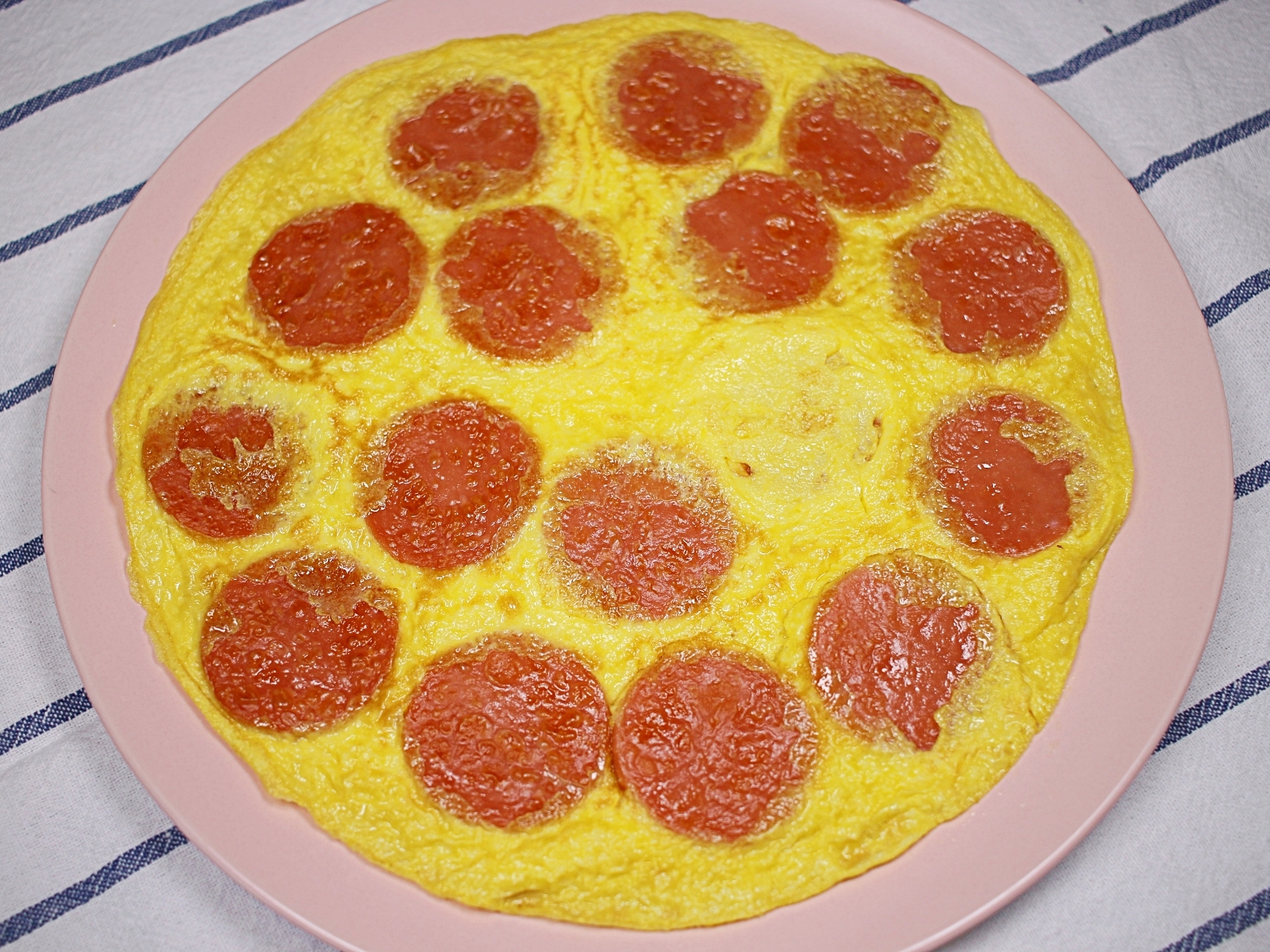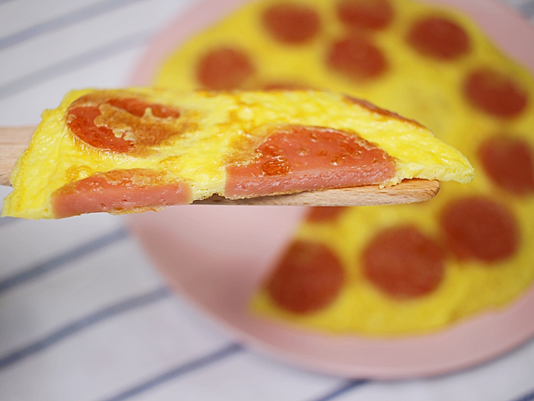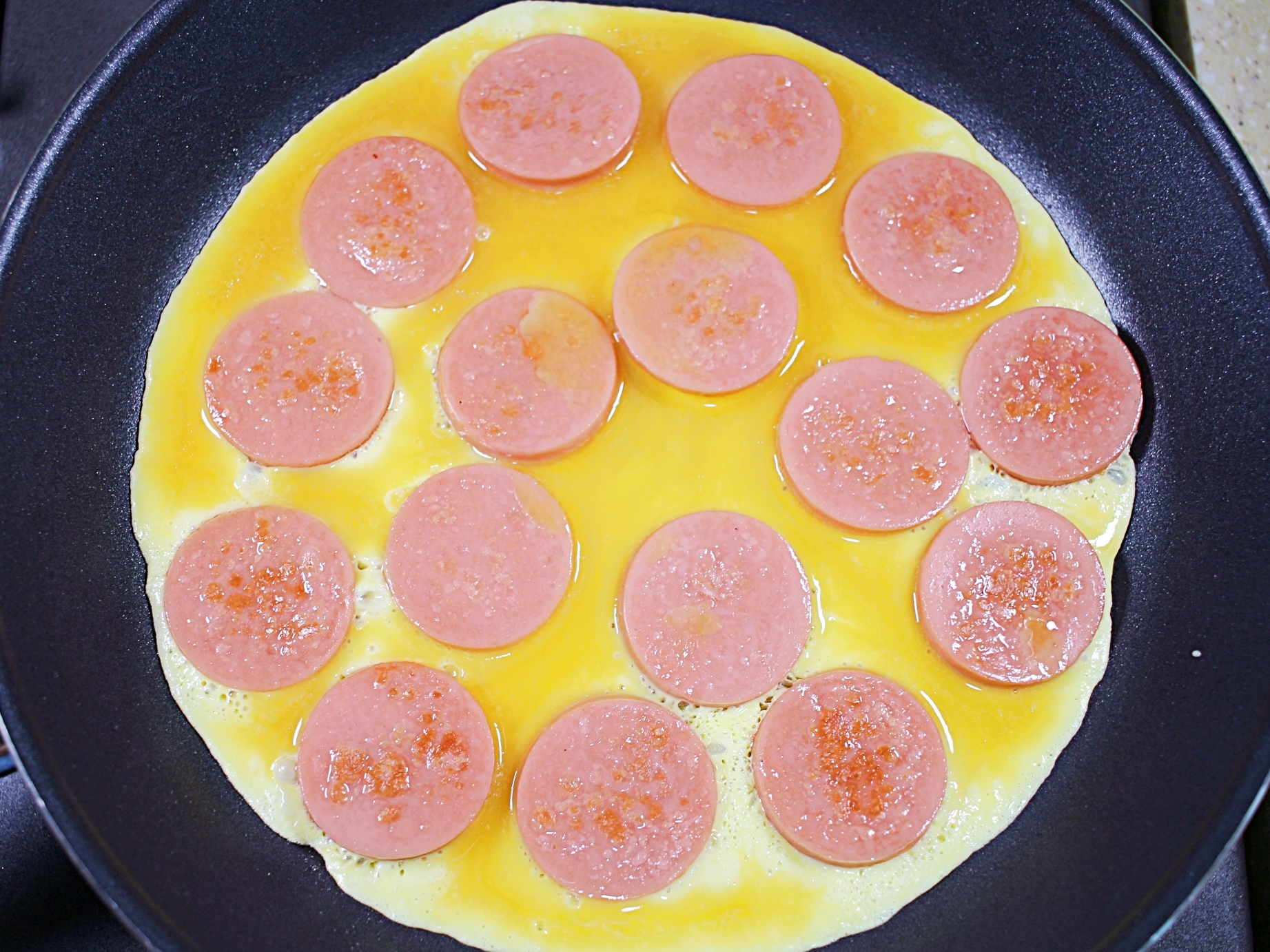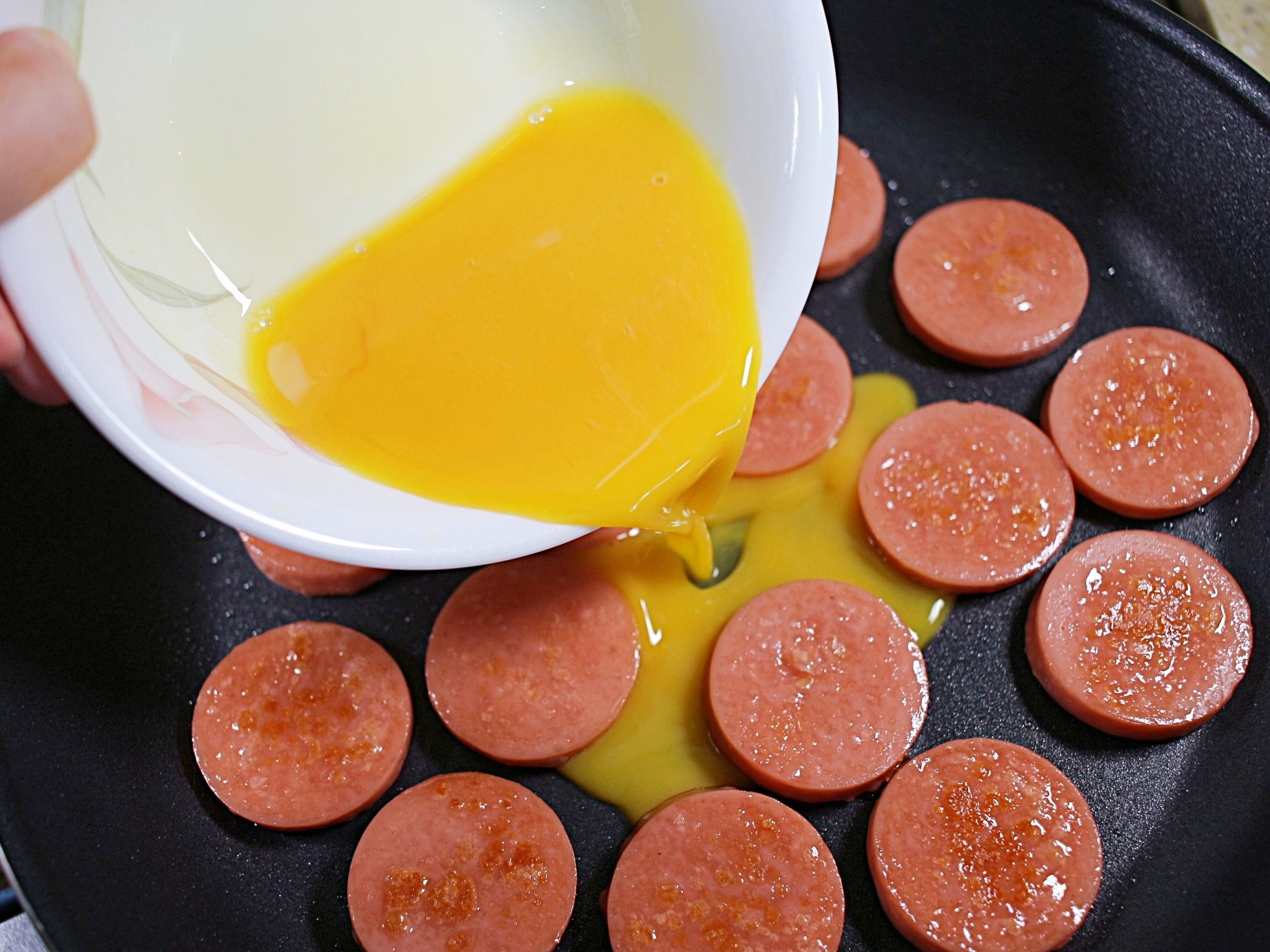 계란물이 분홍소시지 사이의 빈공간을 채우면서