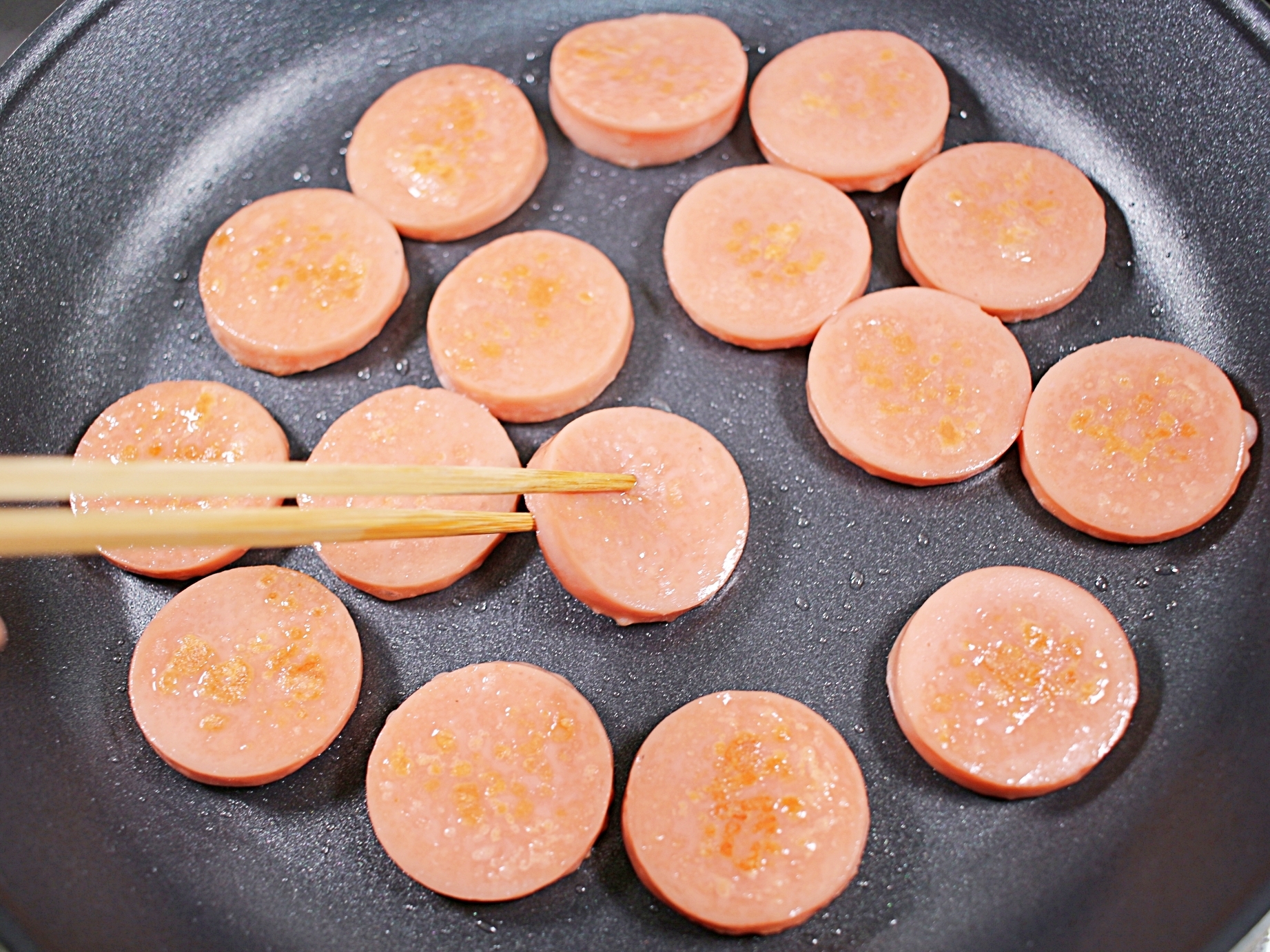 분홍소시지를 노릇하게 부쳐내면