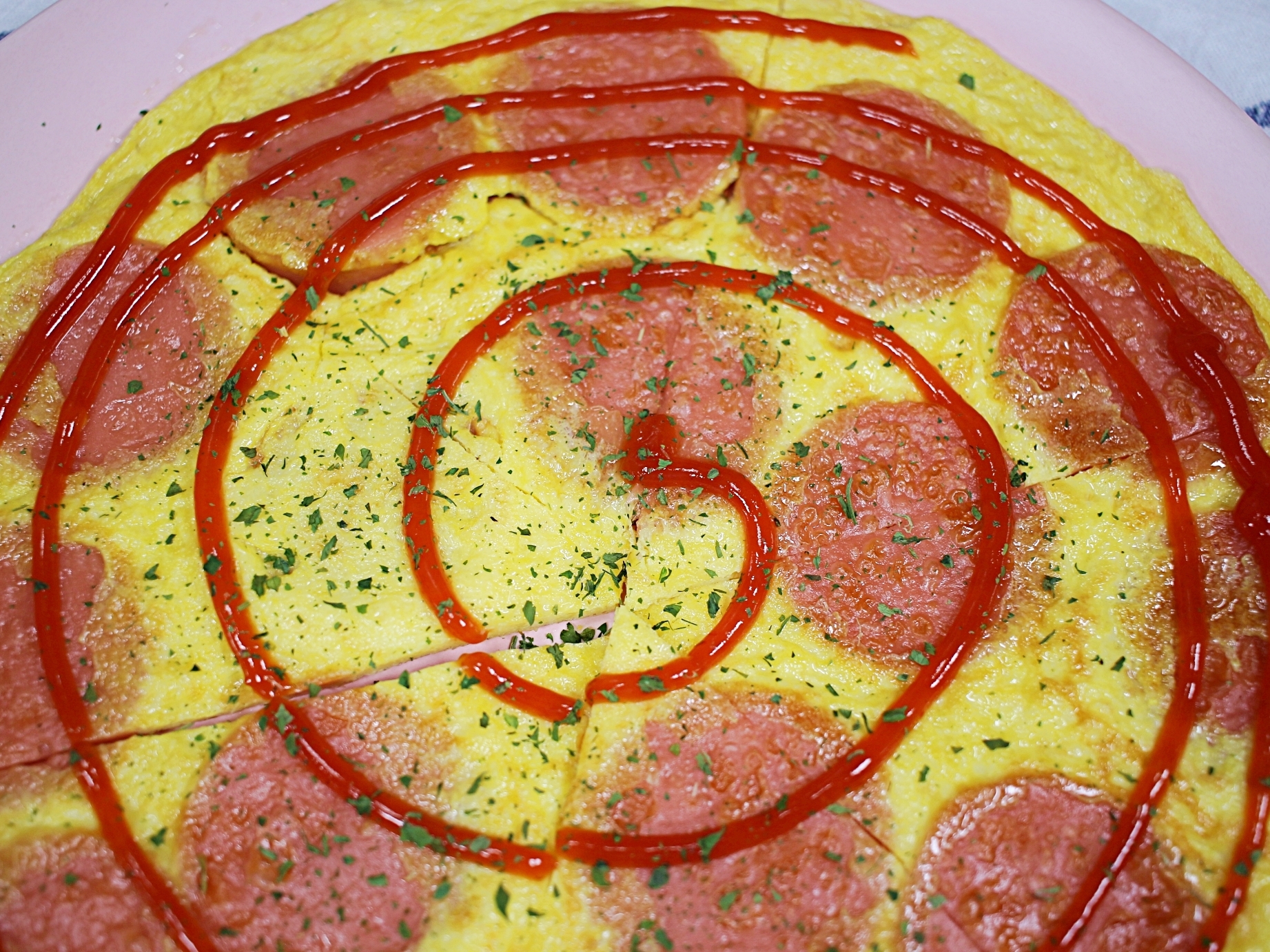 피자처럼 커팅하고 케첩도 뿌렸어요.